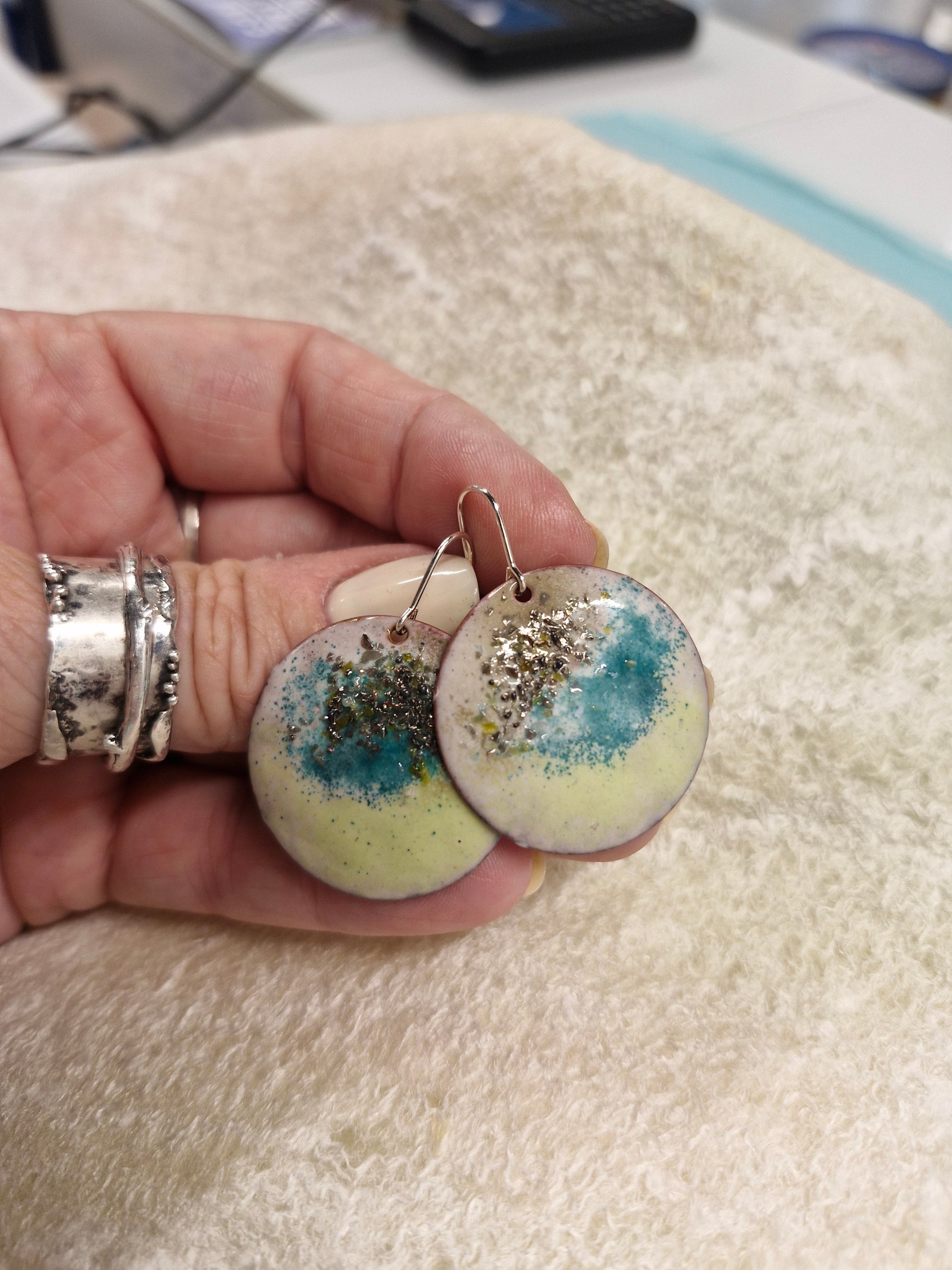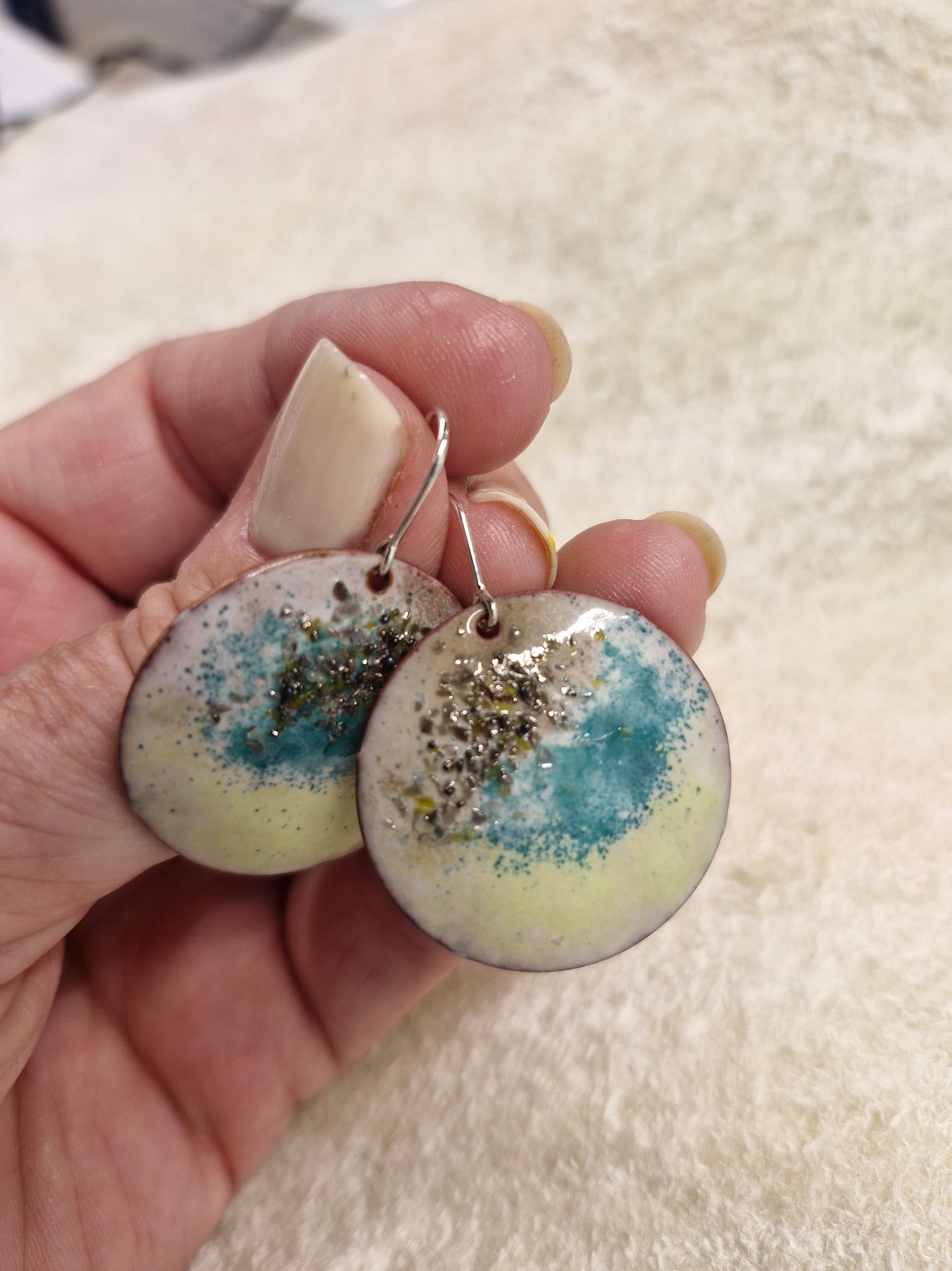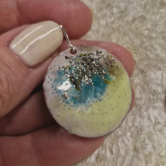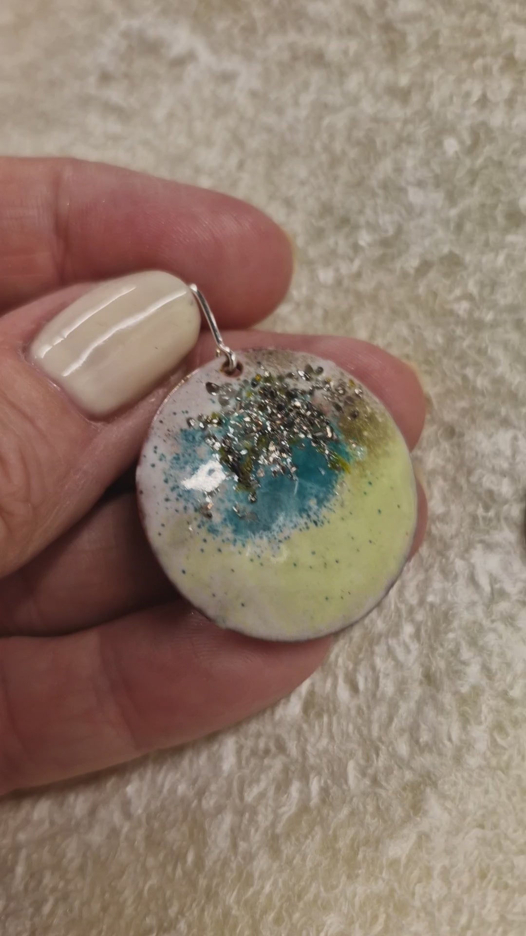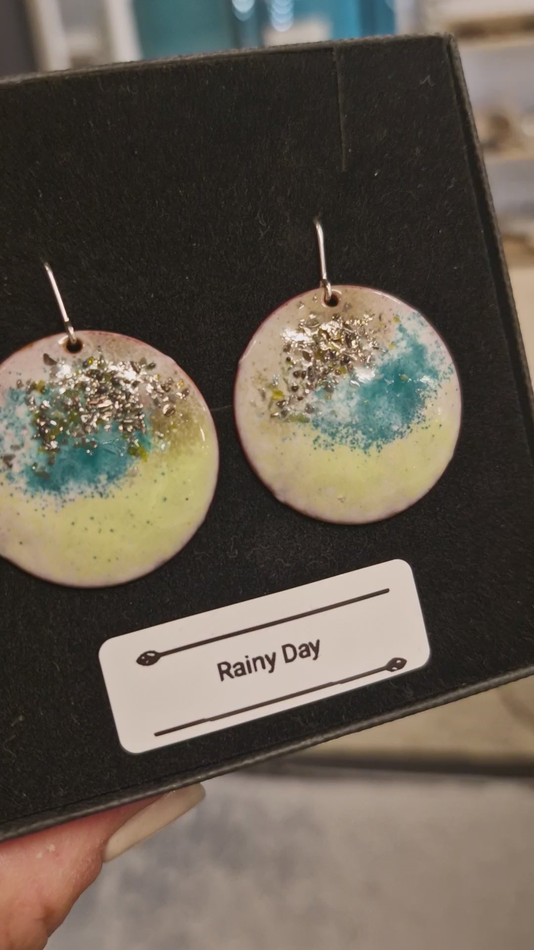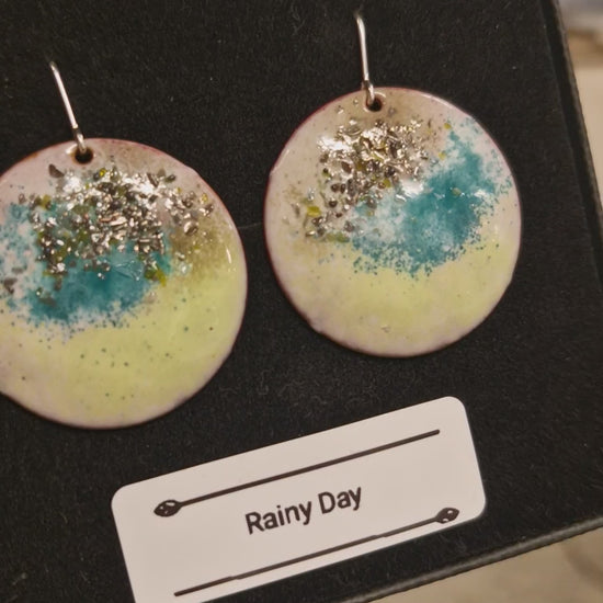 Discover the beauty of a Rainy Day with our unique earrings. The green grass colors mimic the peacefulness of a rainy morning, while the tiny heat treated glass pieces provide a shimmer that resembles raindrops and creates texture.