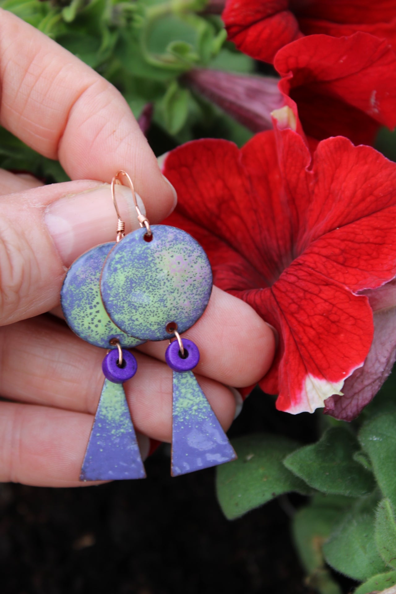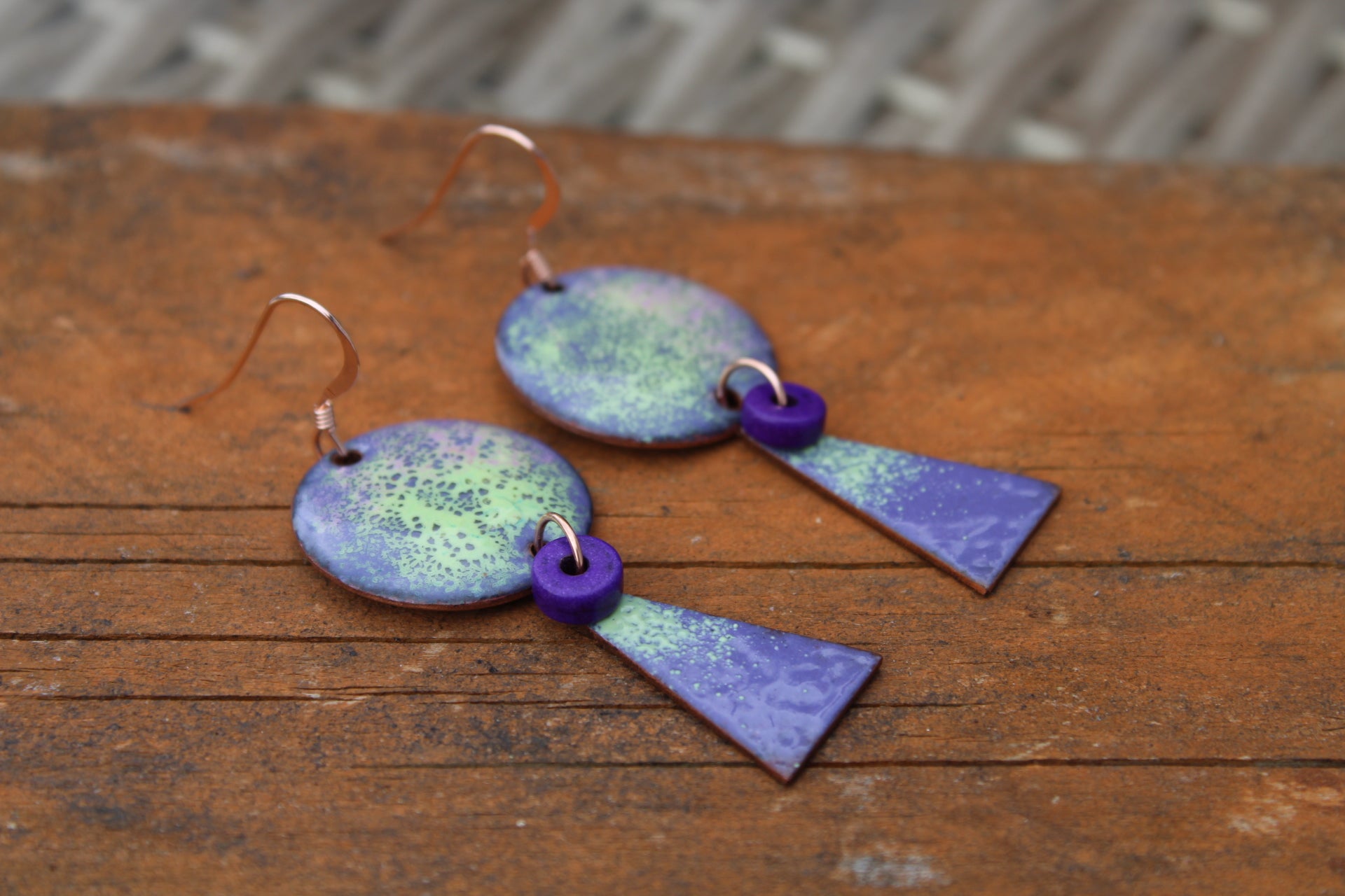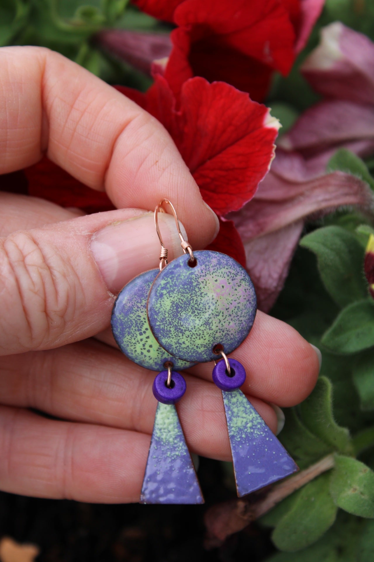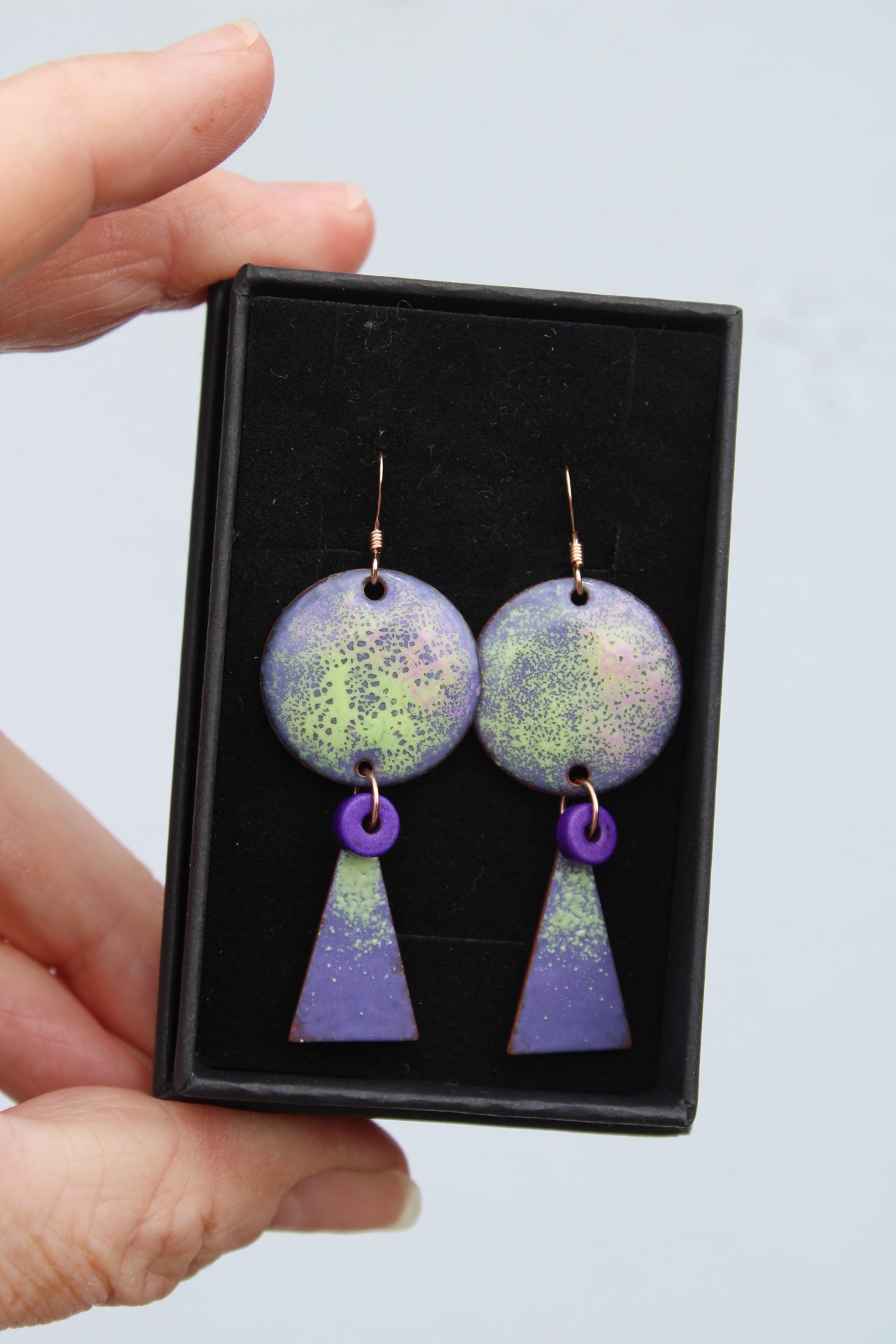 These Aurora Drift earrings are a mix of soft colour and bold shape, inspired by the feel of the northern lights. Made from enamelled copper with gentle shades of purple, green and speckled detail, they’ve got a lovely shimmer without being too flashy. The little purple wooden bead adds a nice pop of colour, and the gold fill hardware for extra luxury. Light and easy to wear, they’re great for everyday but still special enough to dress up a bit.