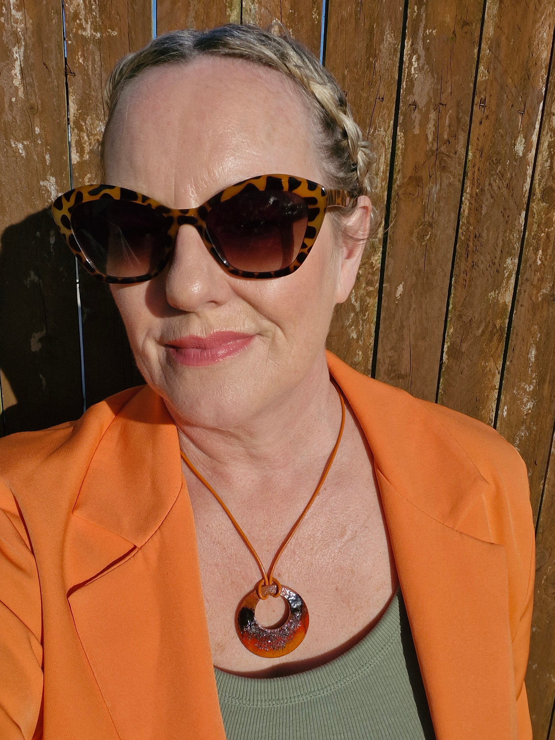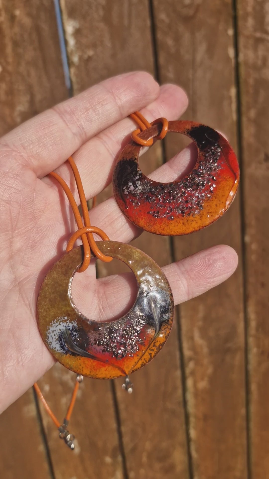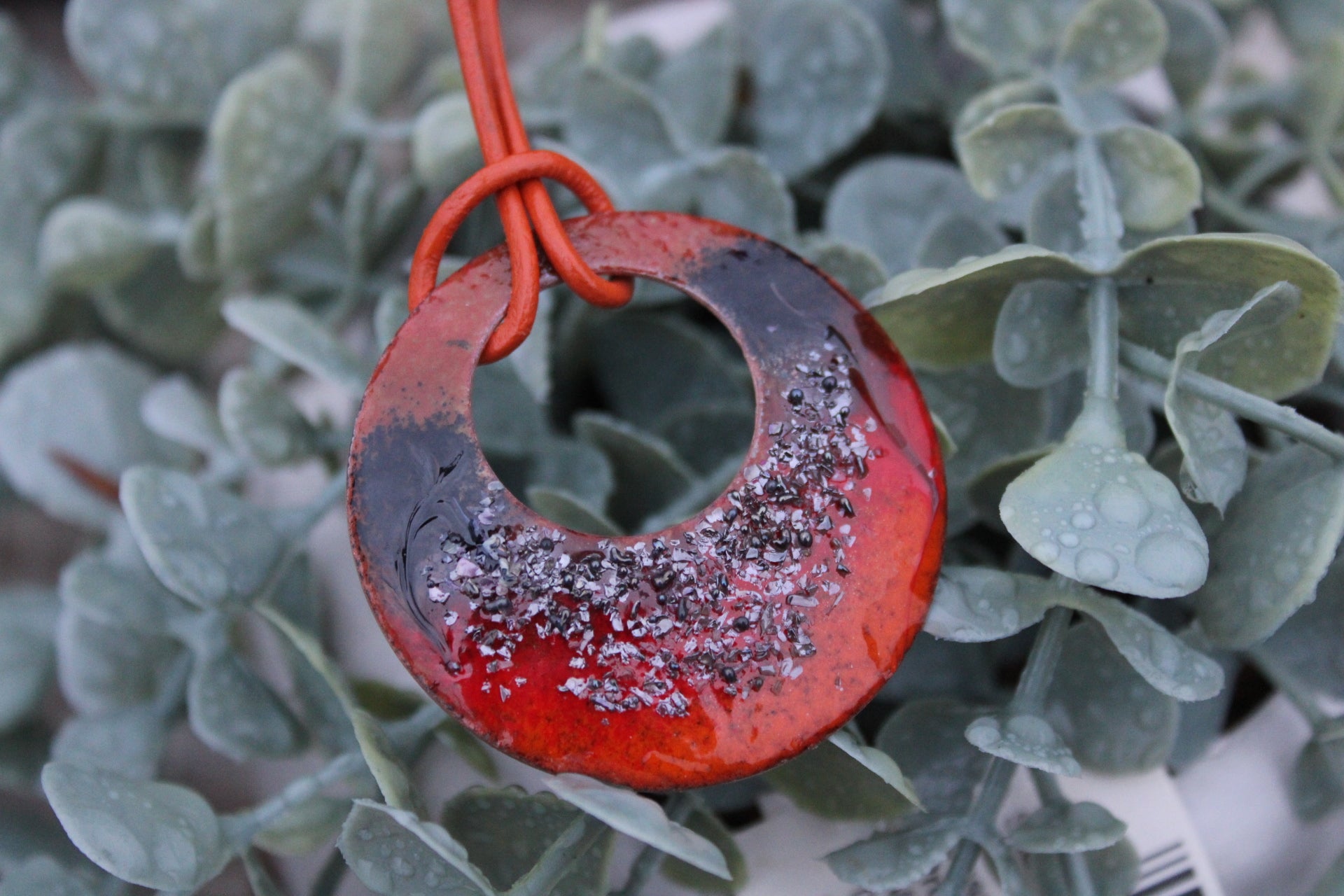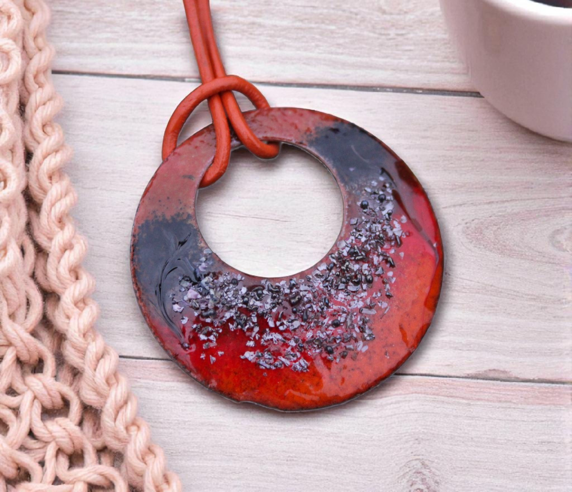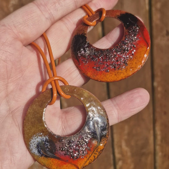 Handmade with care in Ireland, this enamel pendant necklace carries the colours of a woodland walk in autumn. The round crescent shape gives it a natural, organic feel, while the orange leather cord adds a rustic woodland touch.