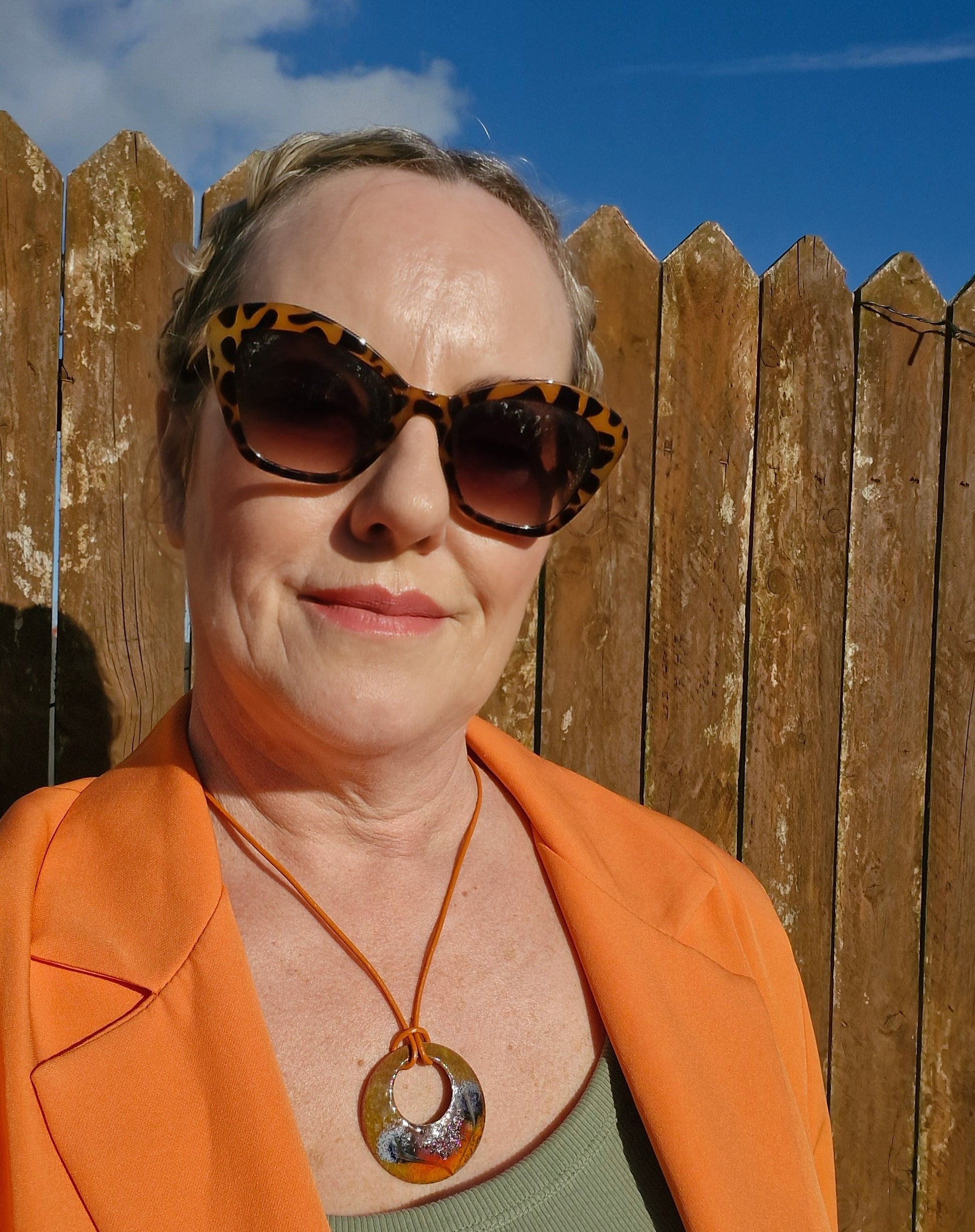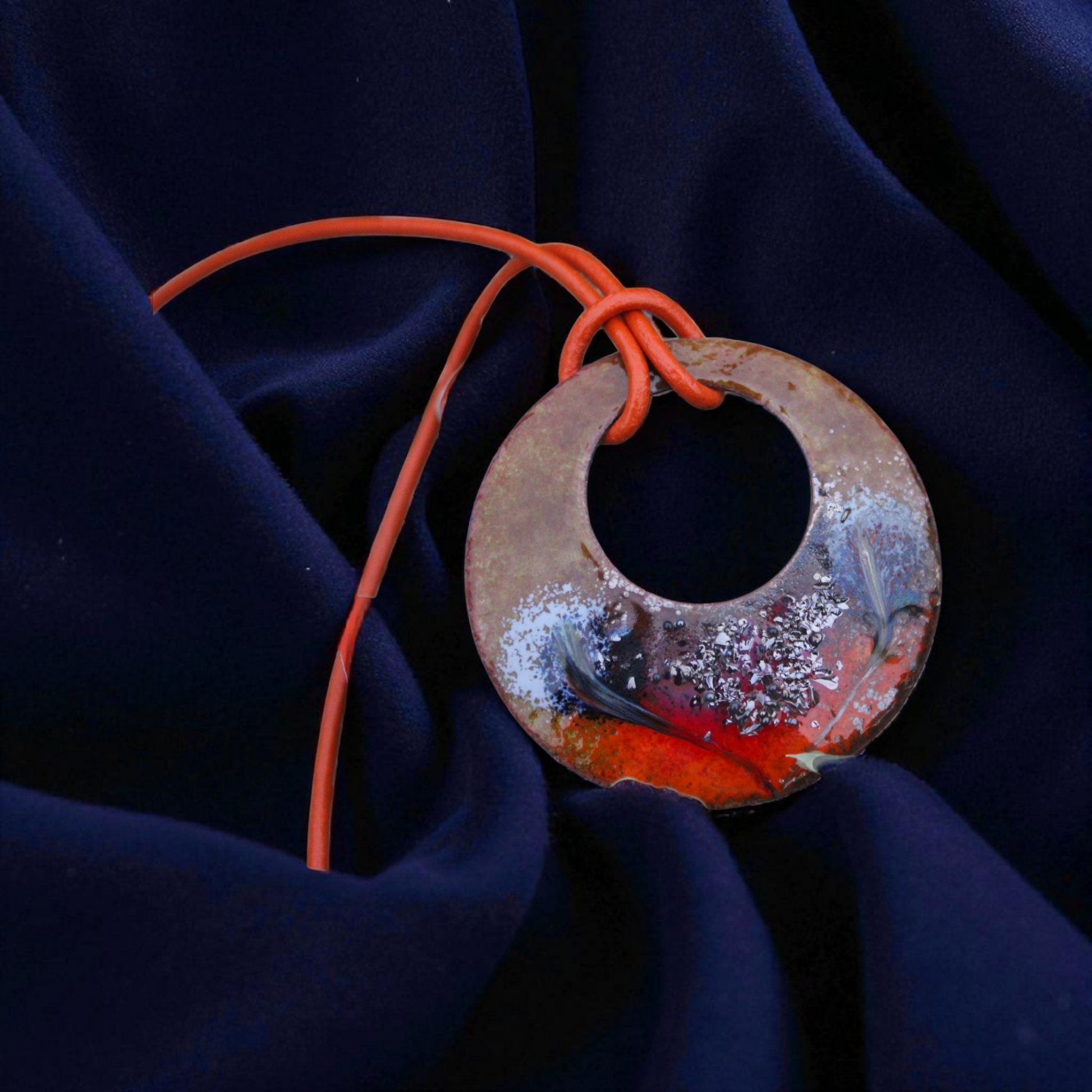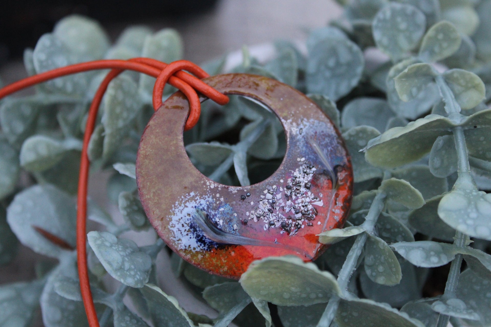 Handmade with care in Ireland, this enamel pendant necklace carries the colours of a woodland walk in autumn. The round crescent shape gives it a natural, organic feel, while the orange leather cord adds a rustic woodland touch.
