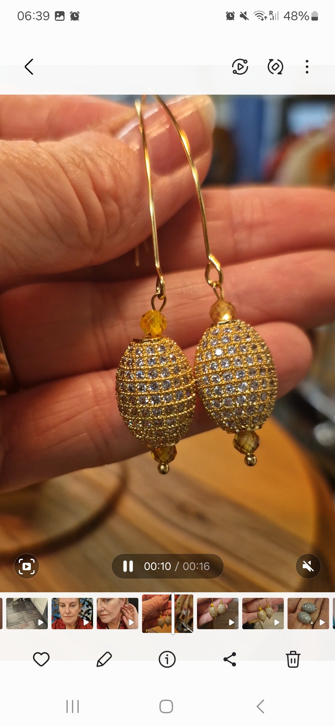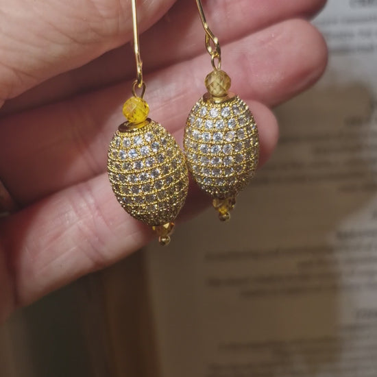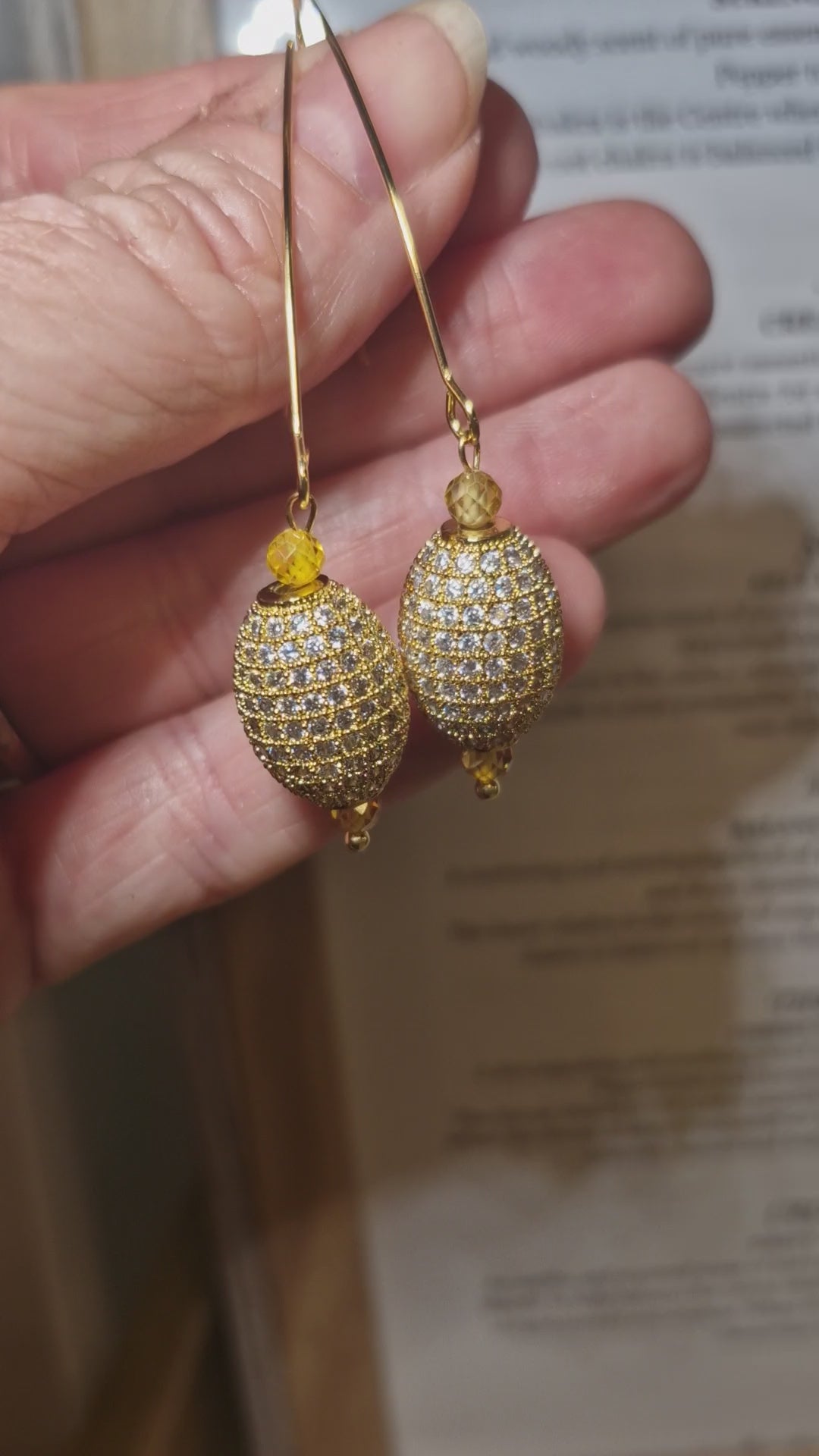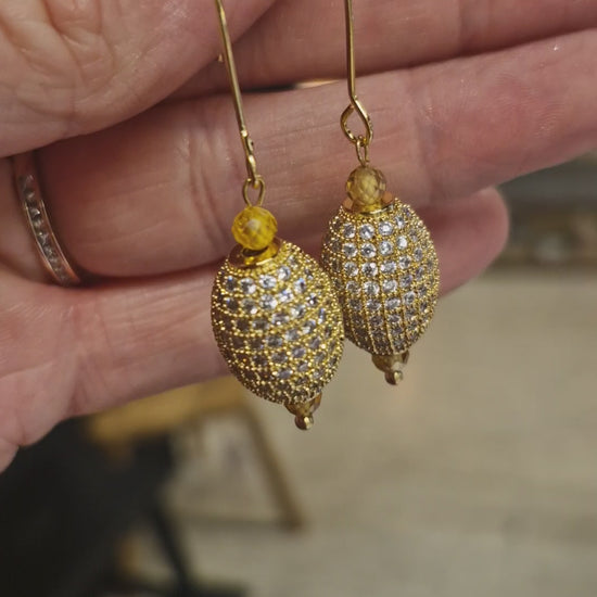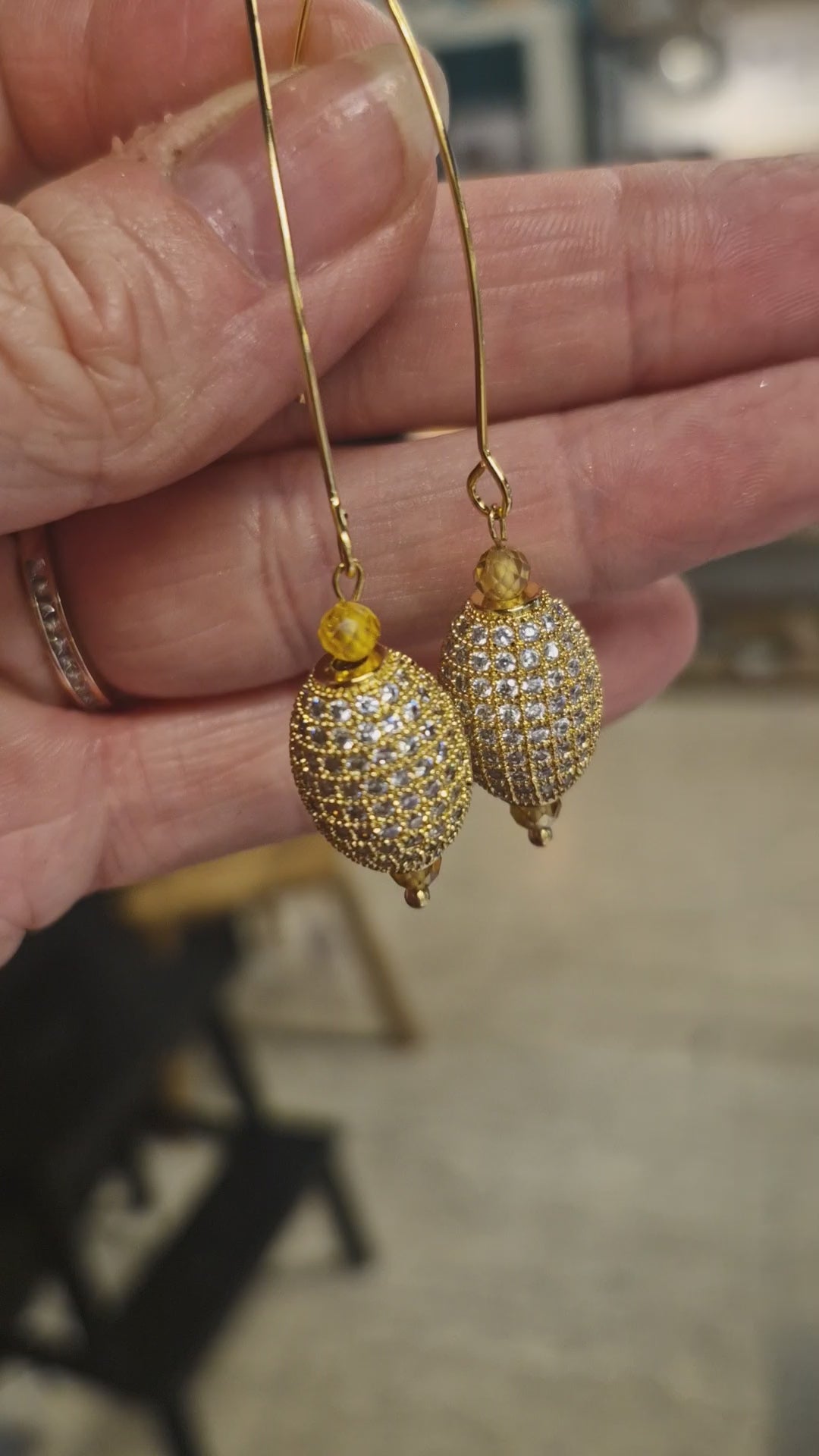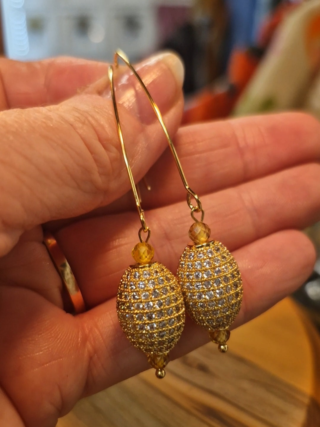 Hundreds of tiny golden beads woven into luminous spheres that shimmer with every movement. Each earring is finished top and bottom with genuine Swarovski crystal, adding that unmistakable, precision sparkle — like miniature disco lights for your ears.