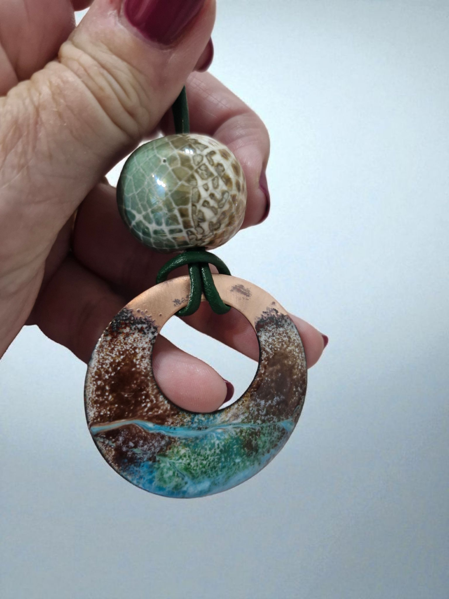This earthy, one-of-a-kind necklace carries the soul of a rugged coastline — shaped by salt air, shifting tides, and ancient rock. A large crackled ceramic bead, in tones of mossy green and sand-washed cream, sits above a hand-fired enamel pendant on warm copper. The enamel work flows in rich browns, ocean blues, and algae greens — like tidepools caught at low tide.