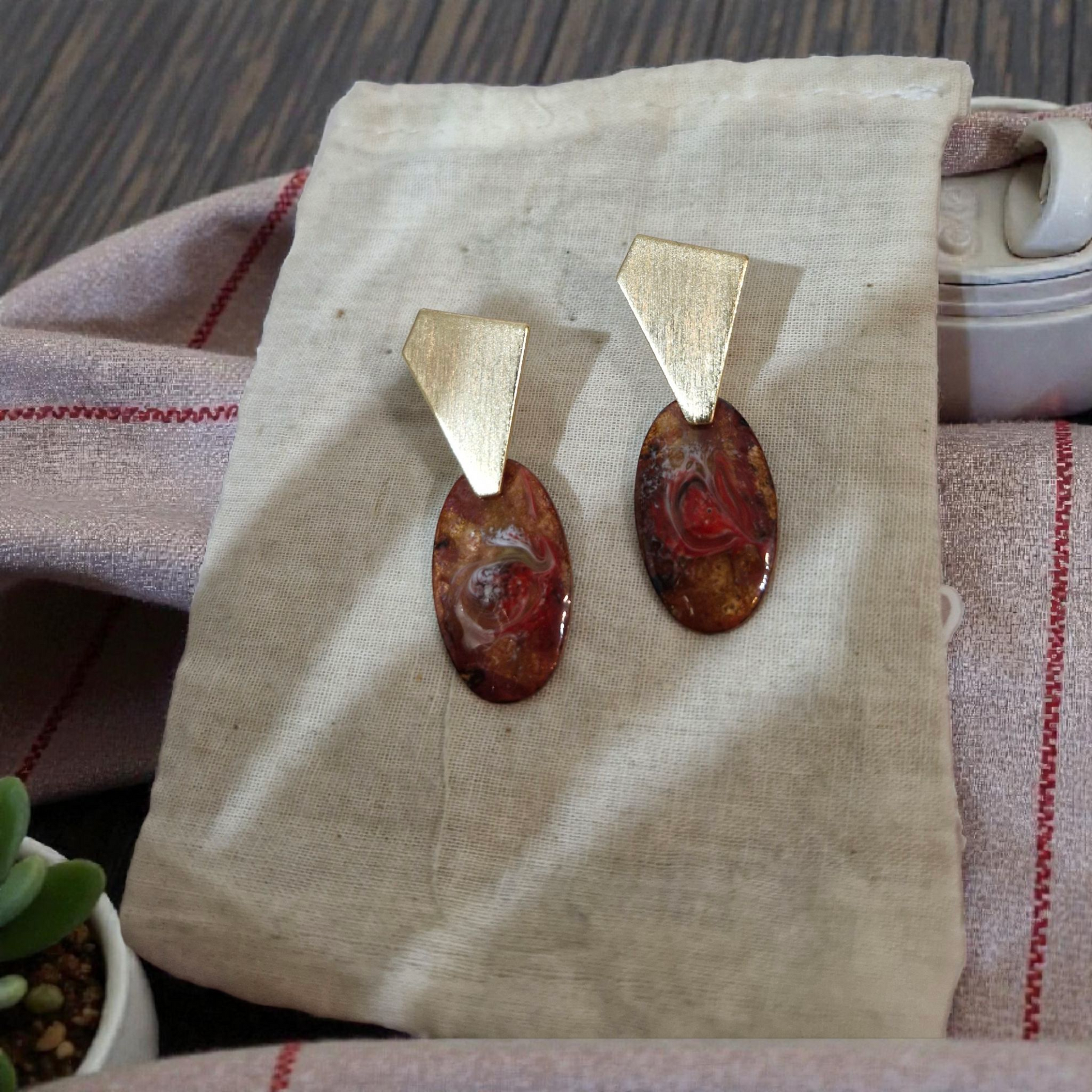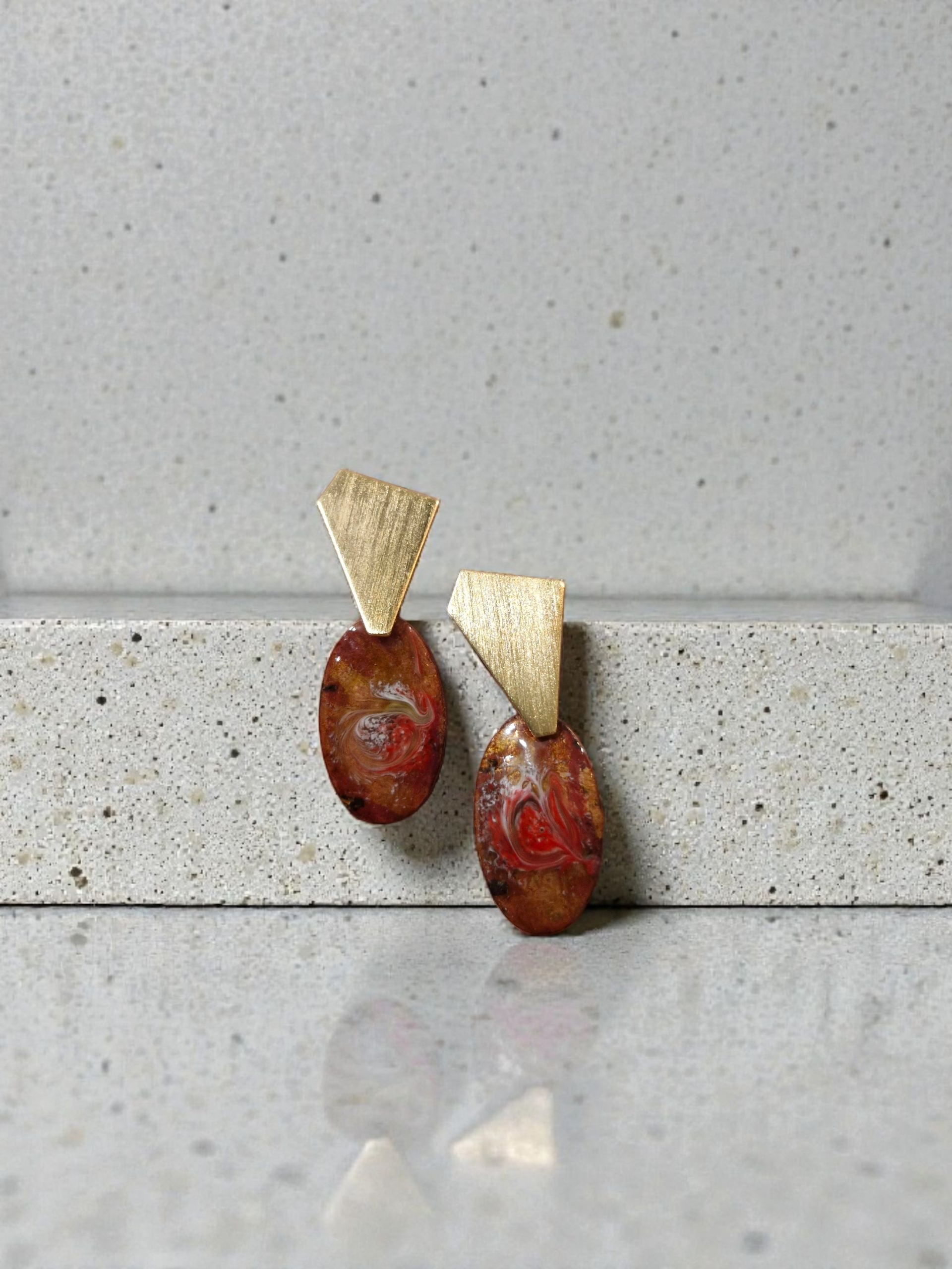 Ember Drop pairs warm, red–amber enamel with a sharp brushed-gold stud for a clean, modern look. Bold colour, simple shape, easy glam.
