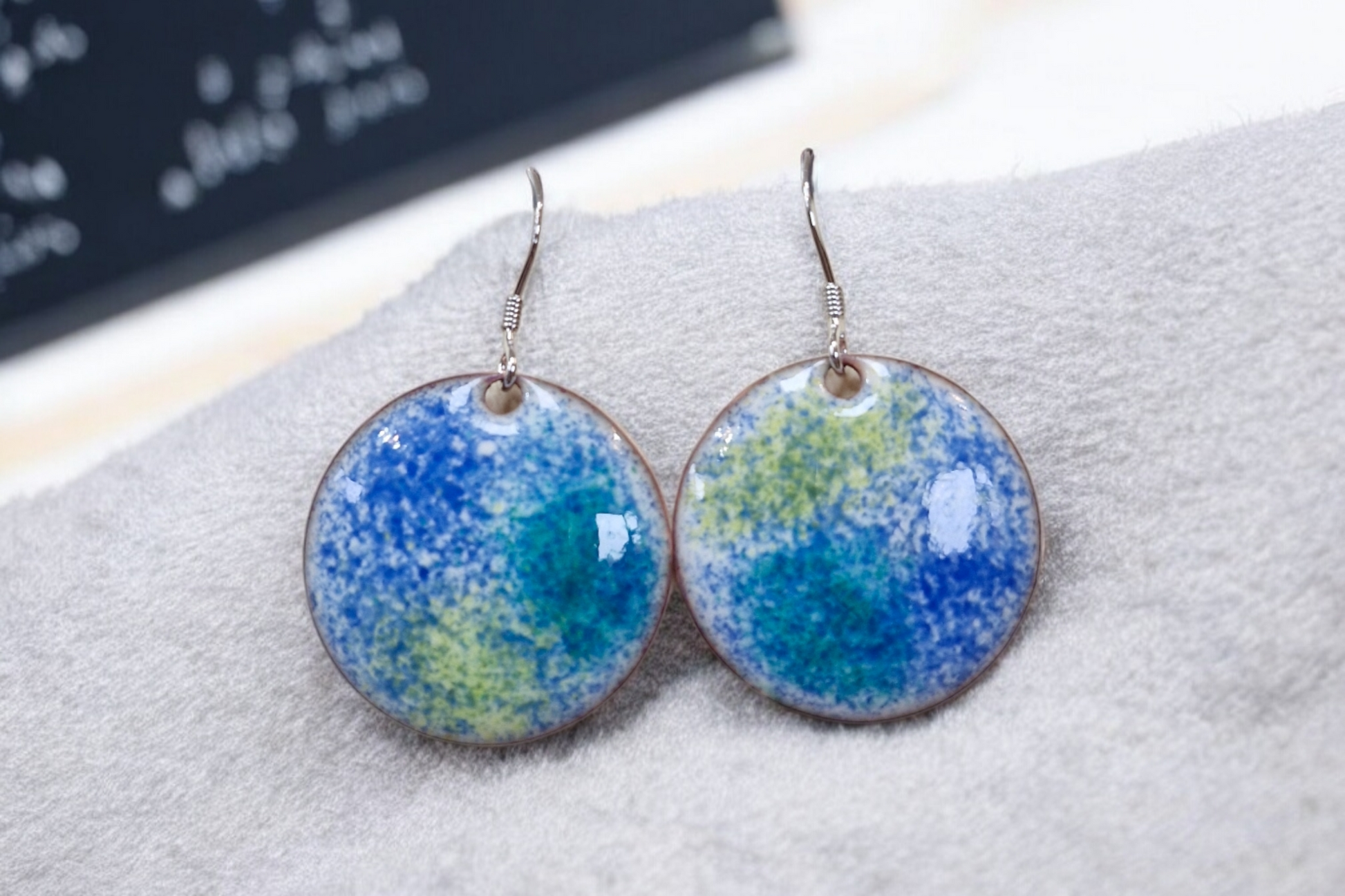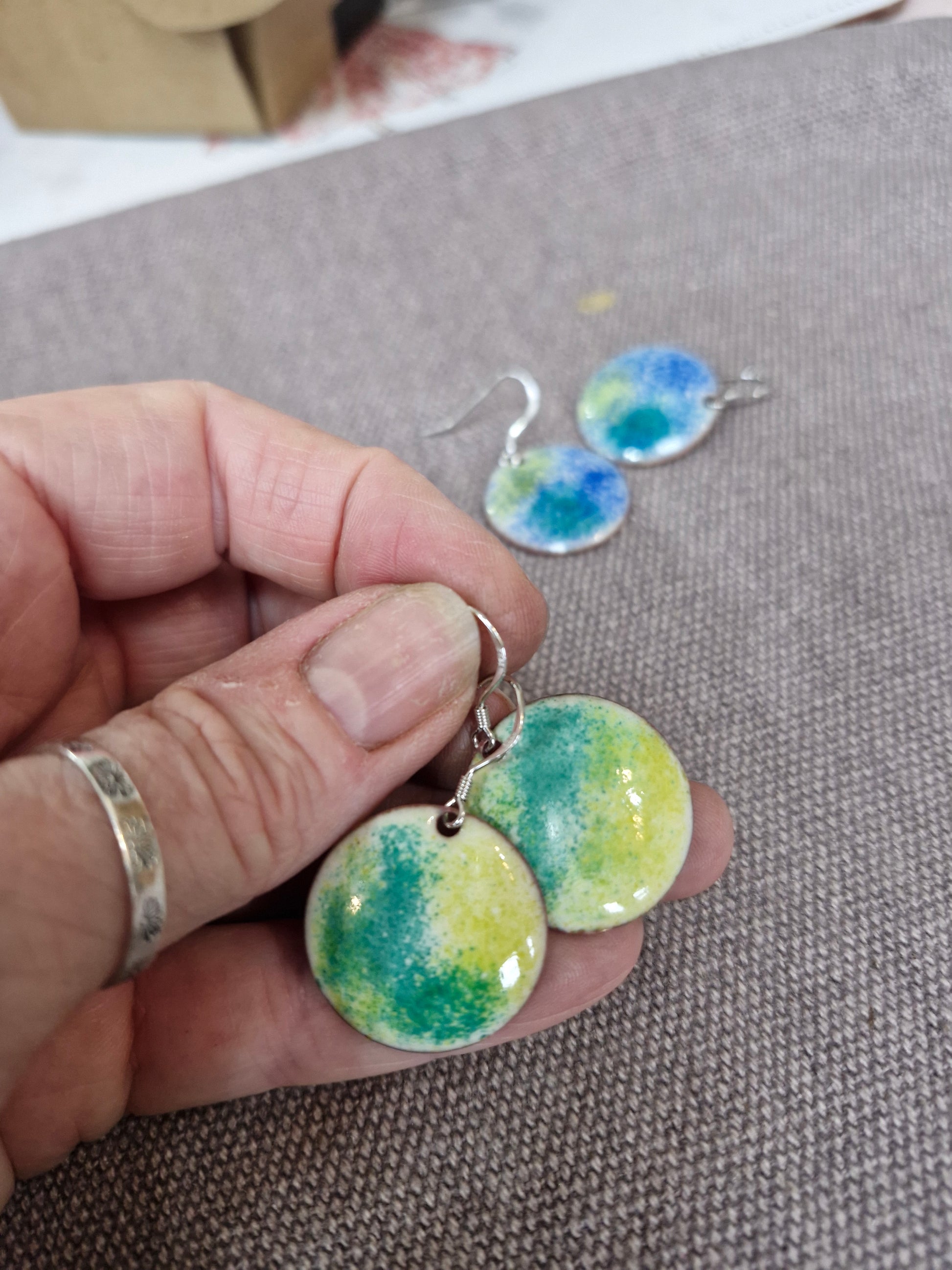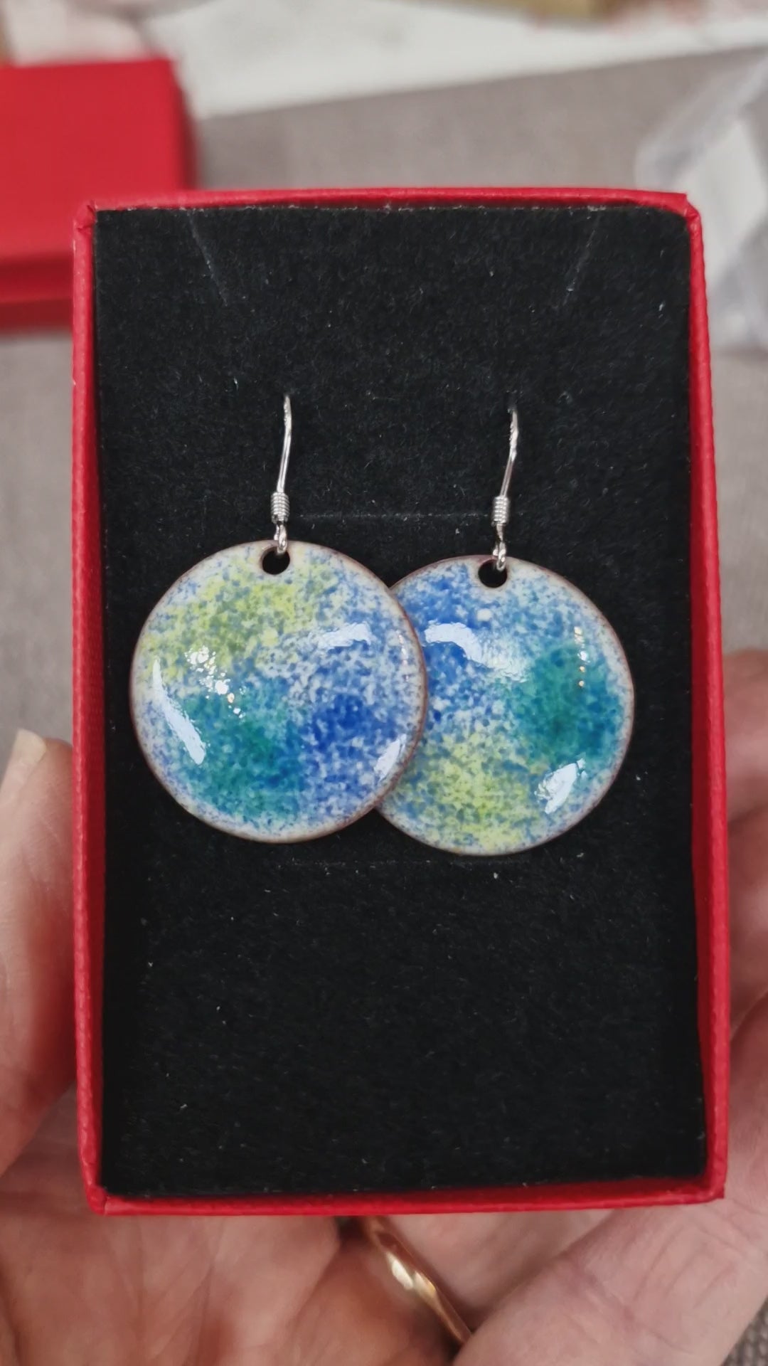 2cm diameter of gorgeous transparent enamels, torch fired individually to copper. With sterling silver earhooks.