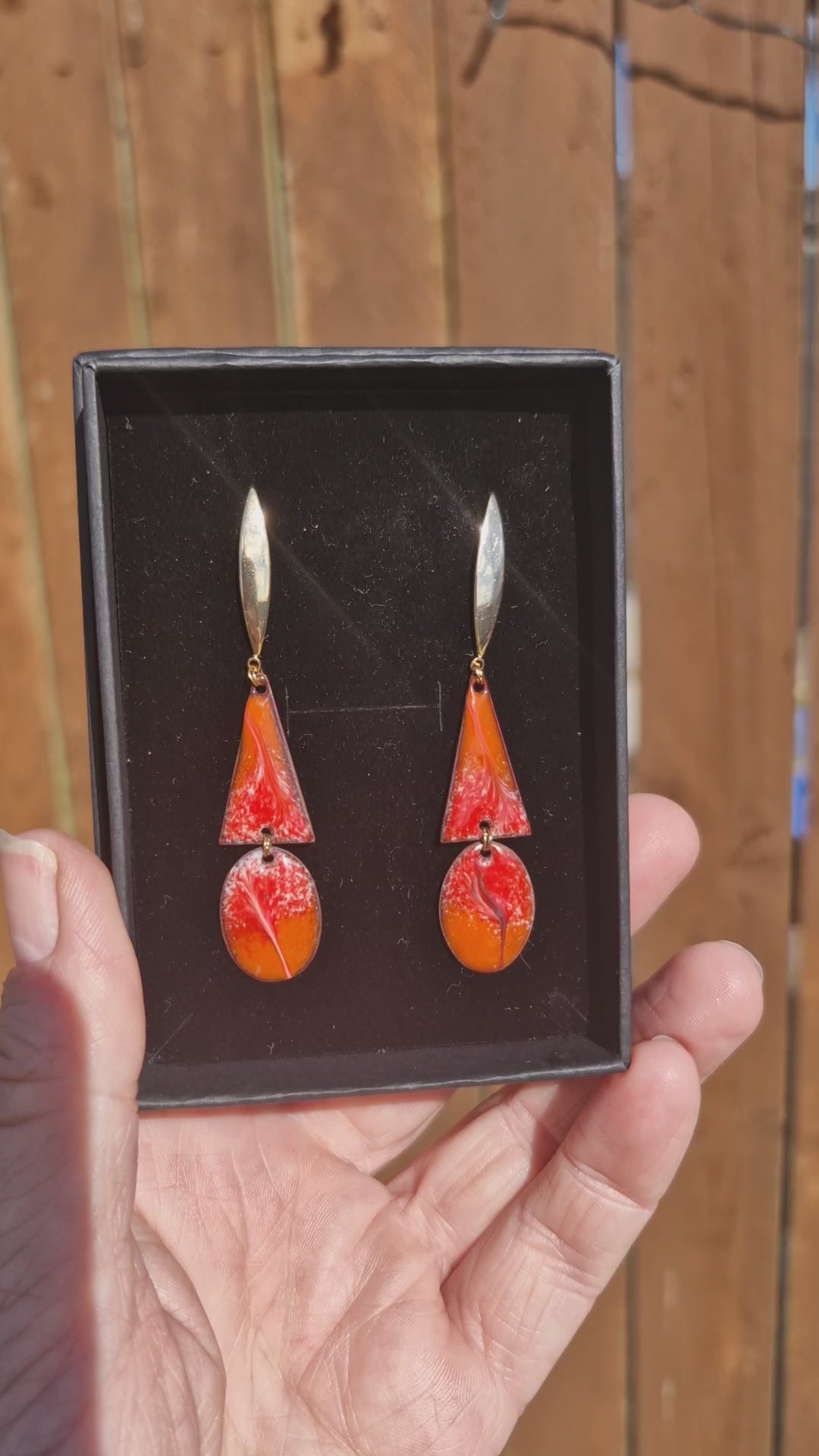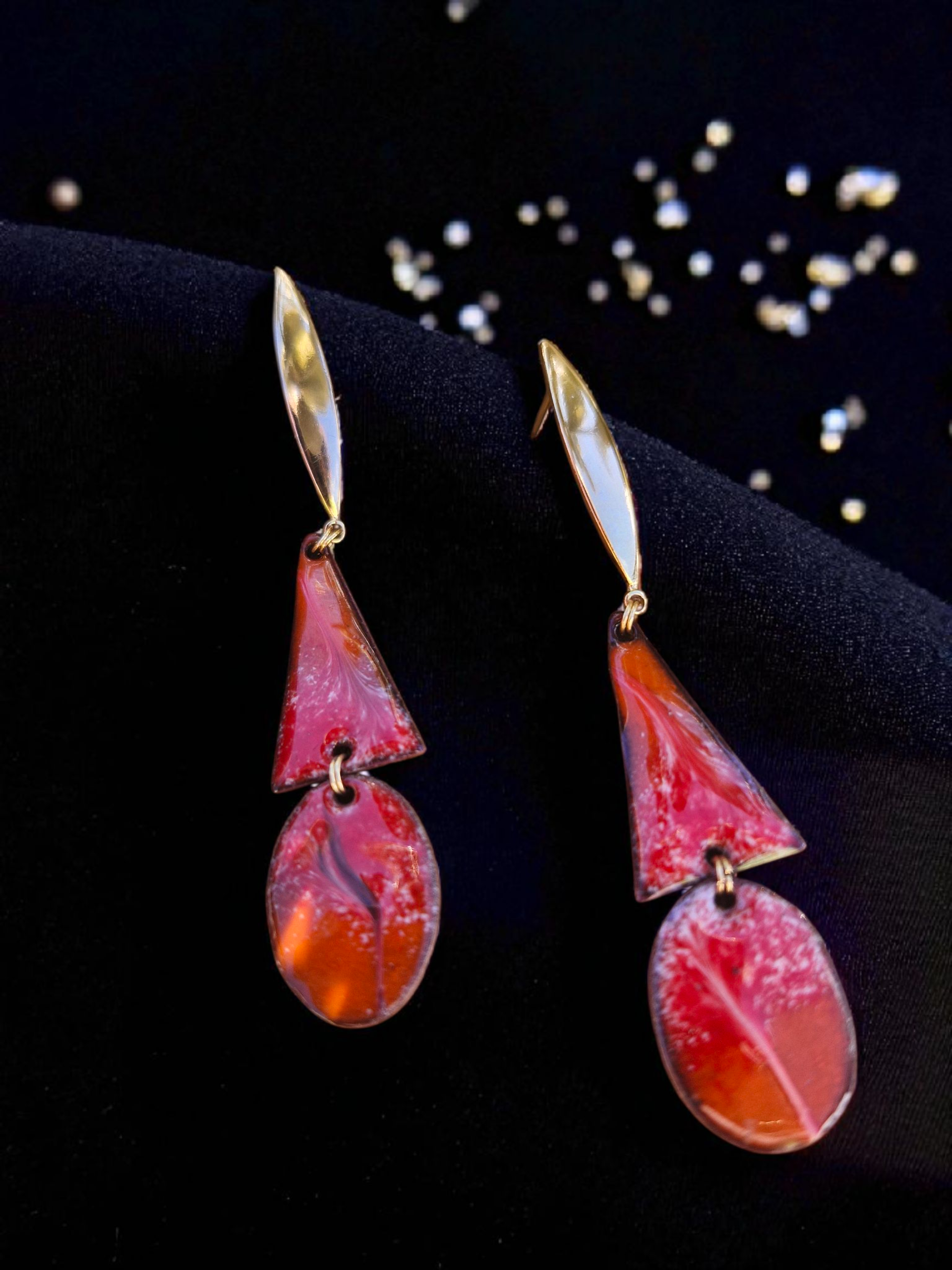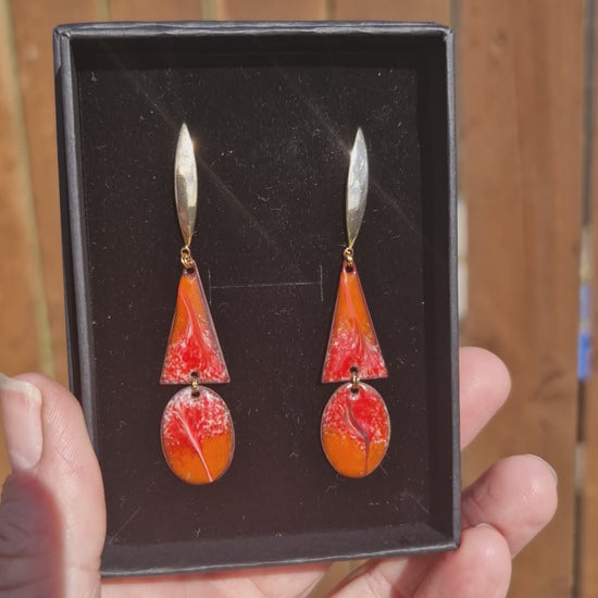 Drenched in molten red and orange enamel and set against golden gleam, these earrings are made for nights that stretch beyond midnight. Bold yet elegant, their fluid shapes catch the light like candle flames and cocktail glass reflections. At just the right length to make a statement, they bring that head-turning glamour reserved for the afterparty — where velvet shadows, champagne sparkle, and unforgettable moments unfold.