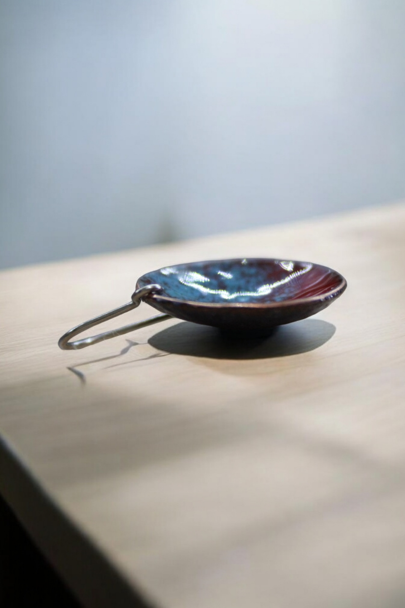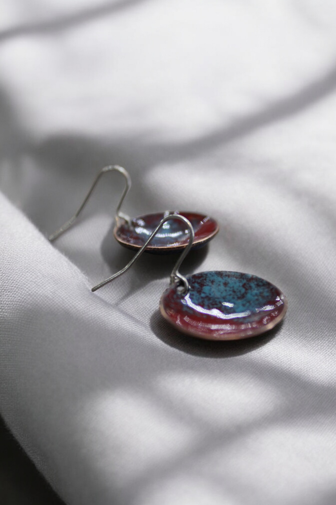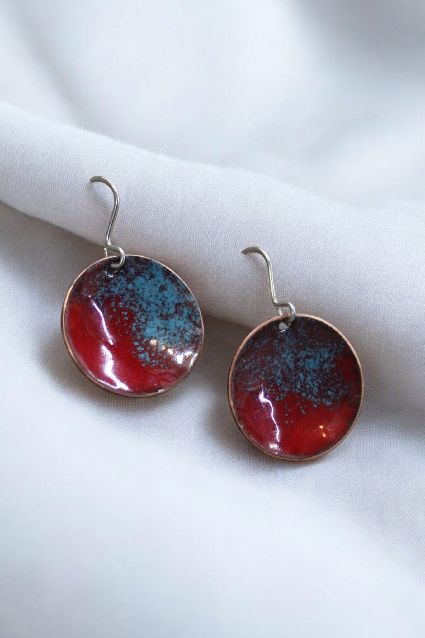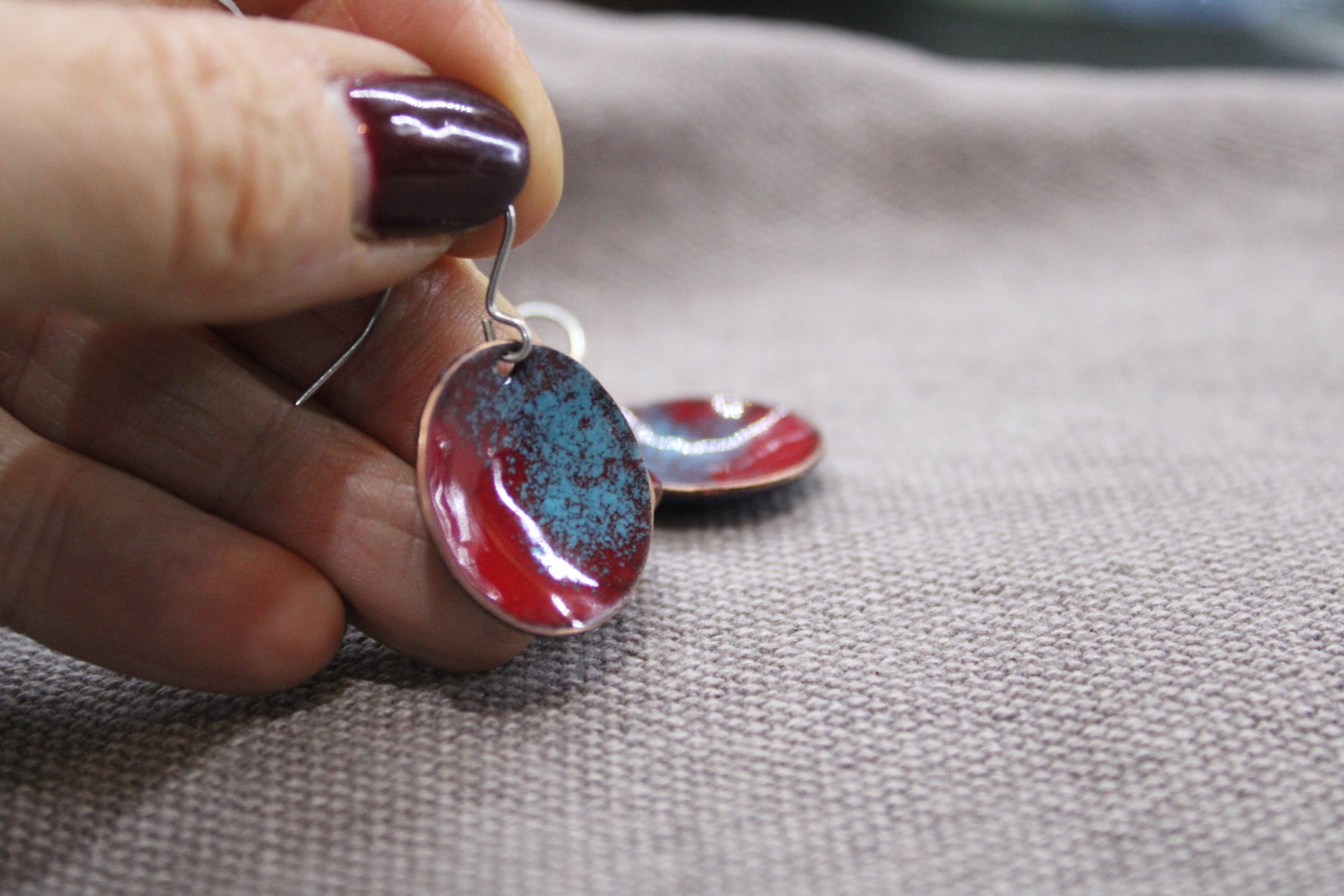 Deep ruby red , enamelled on a hand cut, hand domed copper piece. The contemporary design is on the inside concave of the dome. An interesting twist on a regular flat piece earring.