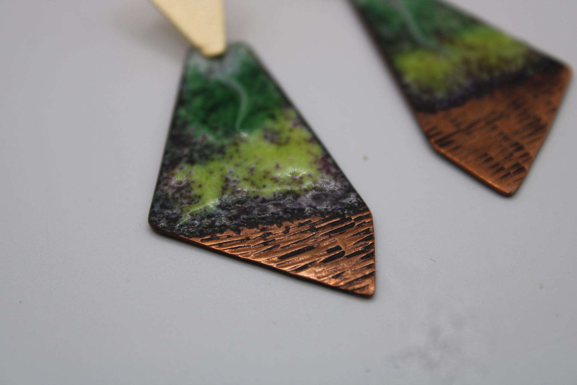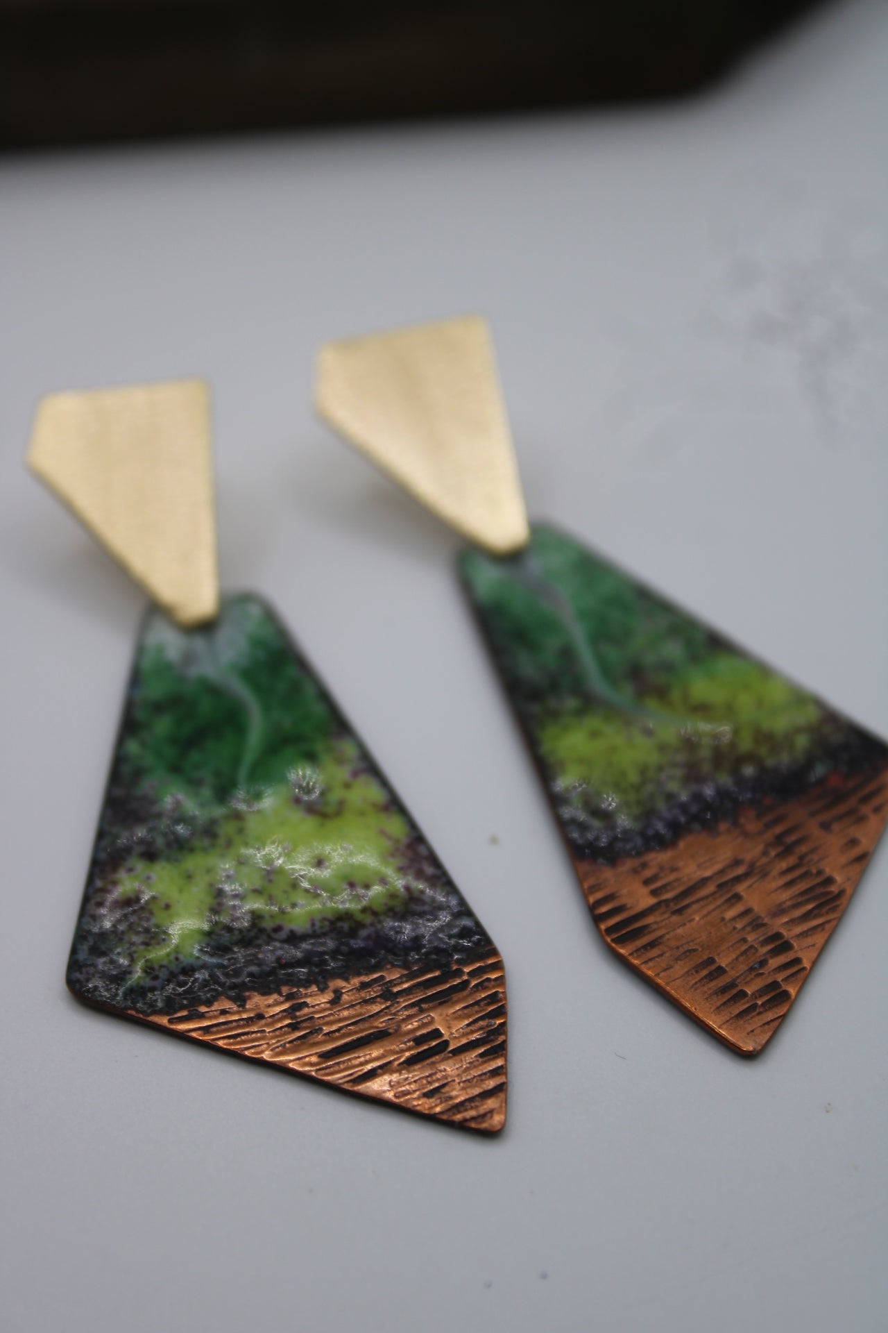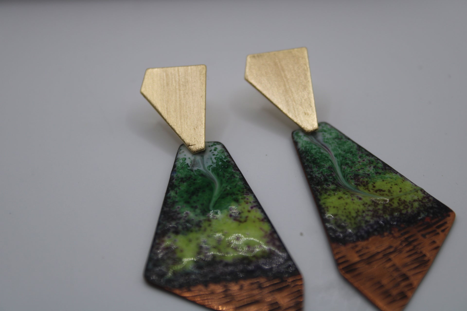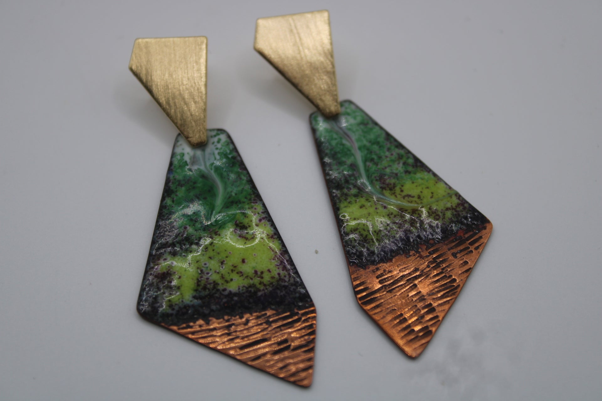 Each piece is handmade in my studio in East Cork, individually designed and created so that no two earrings are ever the same. They are made from copper and enamel, using traditional hand-firing techniques where powdered glass is melted directly onto the metal by flame 850°c, rather than using a kiln. This process gives every piece its unique colour, texture, and character.