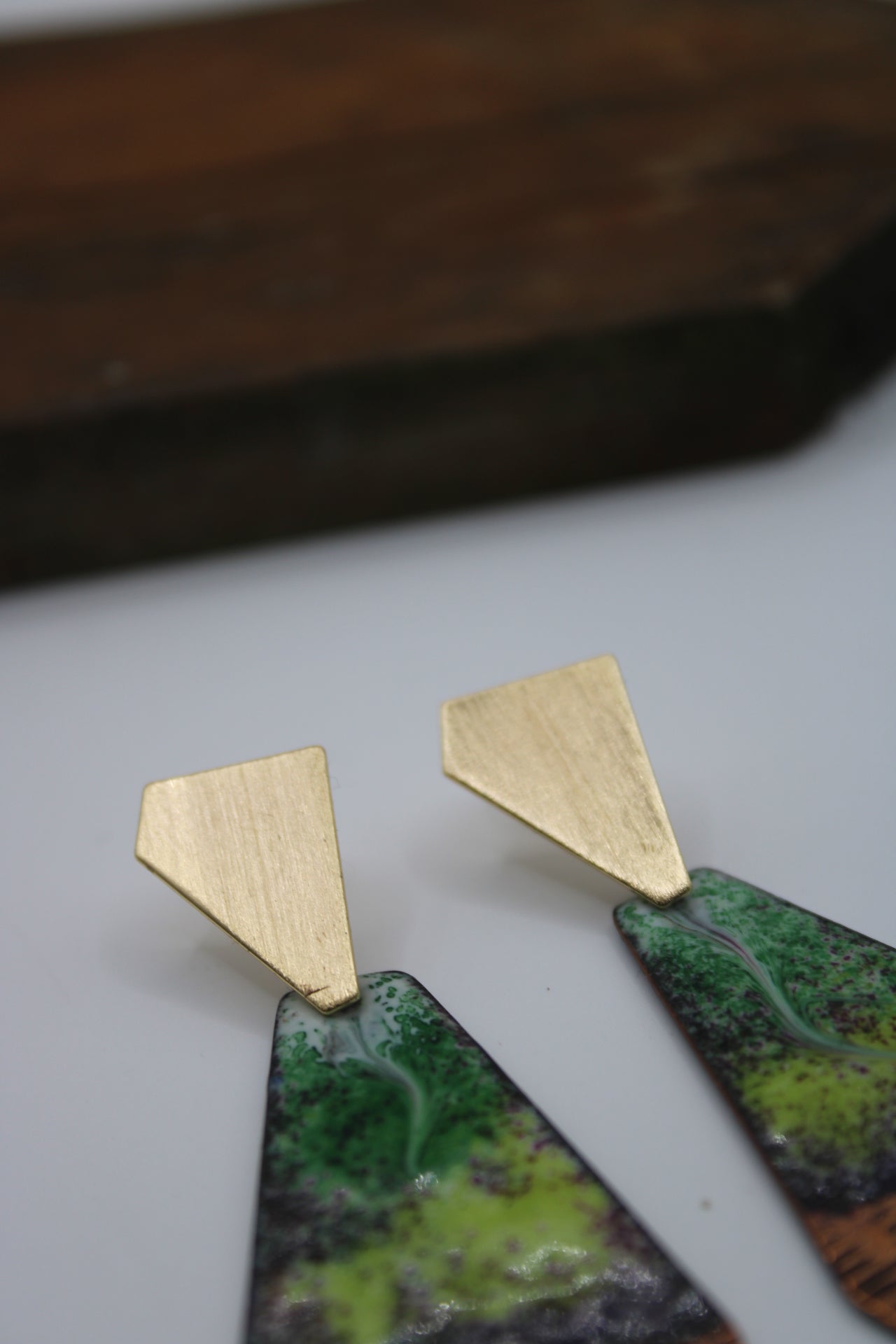 Saoirse earrings feature a combination of brushed gold plate studs, smooth enamel glass, and textured warm copper, creating a visually striking accessory. The earthy shades evoke a natural aesthetic, enhancing your attire while providing a sophisticated touch. These materials ensure durability while remaining lightweight for comfortable wear.