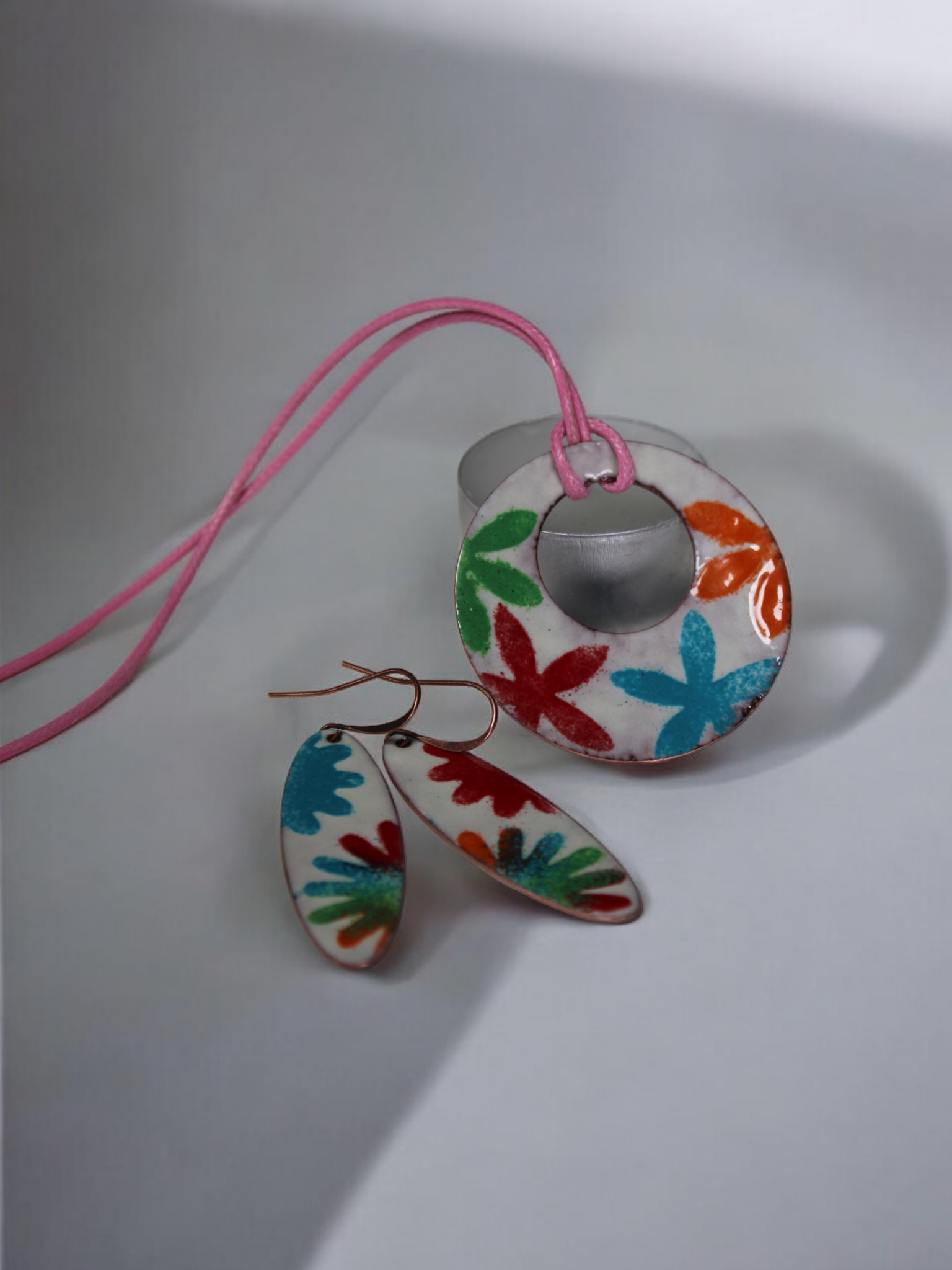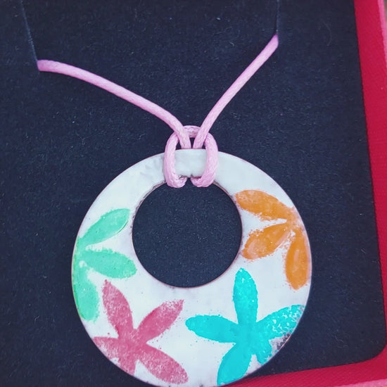 Our beautiful new Piñata necklace, a full 5cm diameter of ivory on copper necklace. Stencilled coloured glass in flower shapes complete the look.