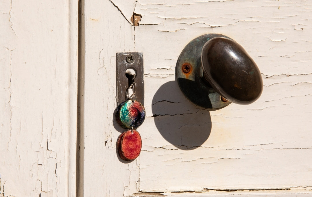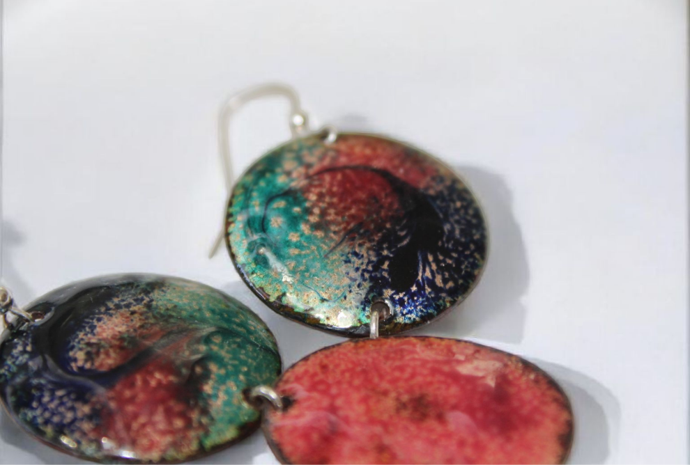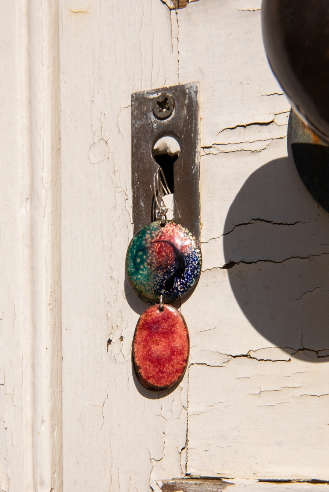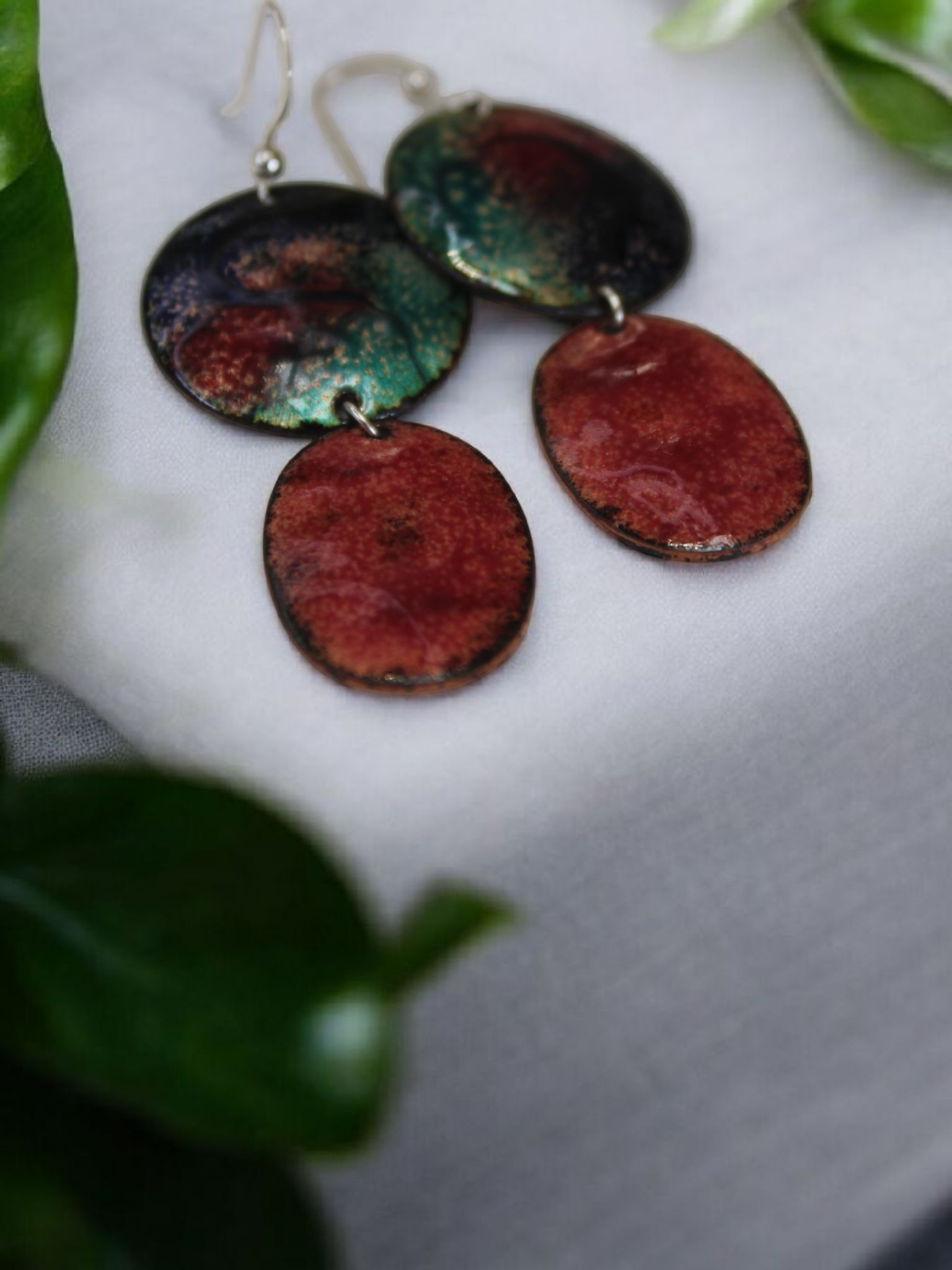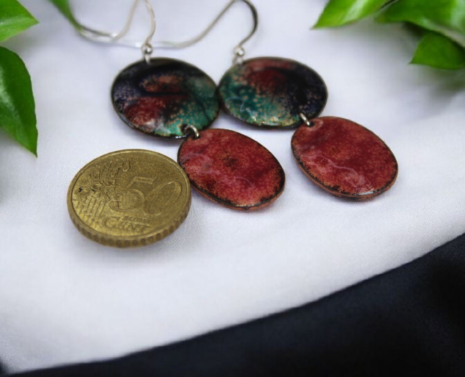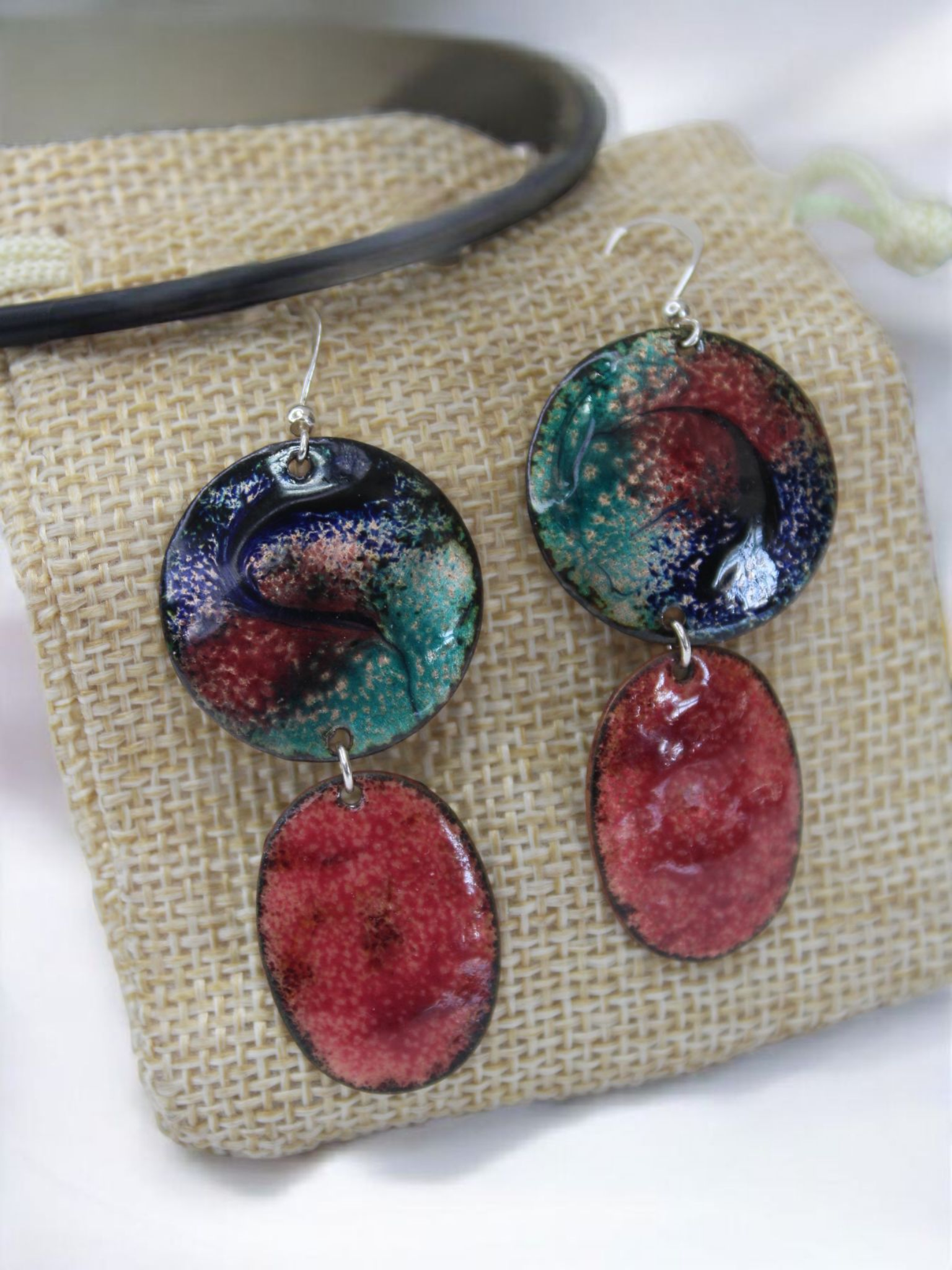 These one-of-a-kind double-drop earrings are made from enamelled copper in rich ruby red and emerald green, with a sparkly silver flux base that shines beautifully.