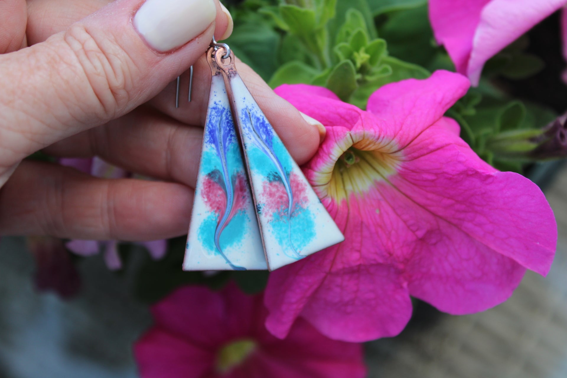 Jewellery is created using copper, glass enamel powders. Each pair is lovingly handcrafted. The metal is cut, shaped and refined, then the powder form enamel is applied and adhered by flame.
