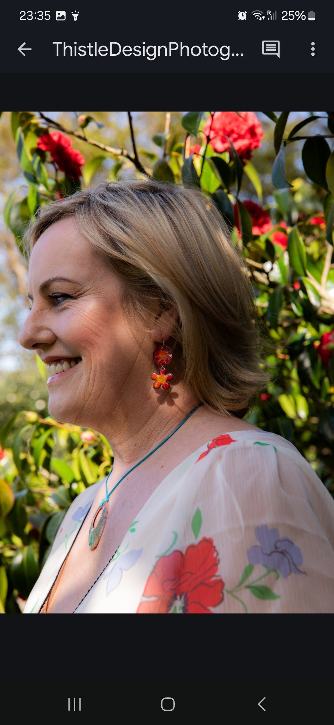 Dimensions : drop from earlobe 6cm, top flower 2.5cm, lower flower 2cm