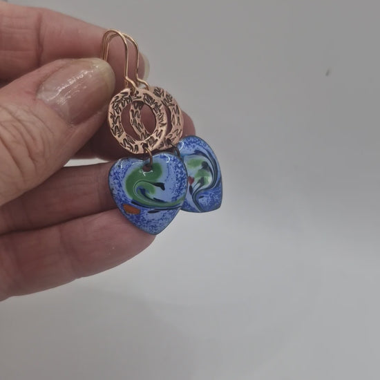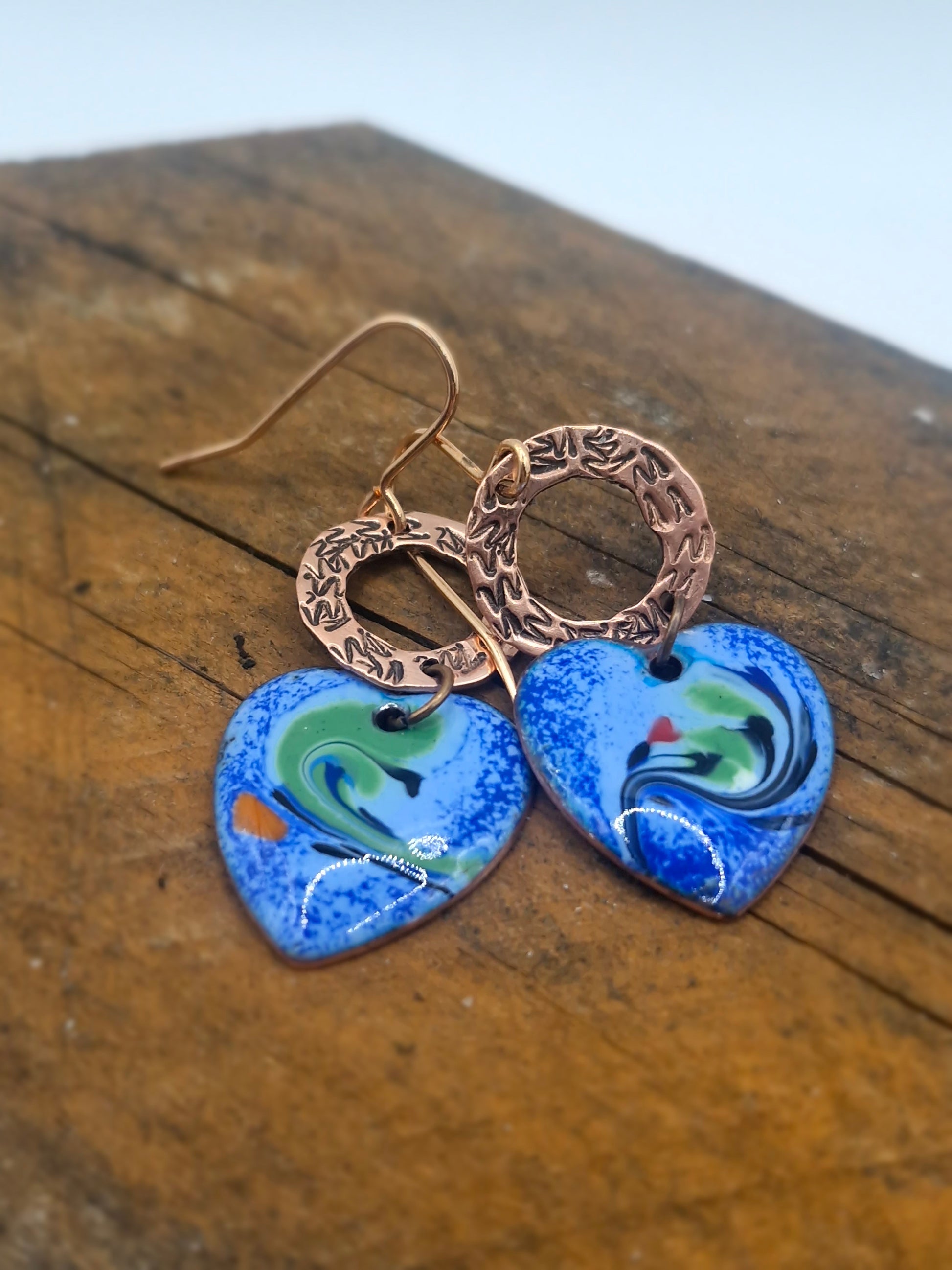 Textured copper rings cradle enamel hearts washed in ocean blues, sea-glass greens and inky currents. The colours move like water — swirling, pooling, never still — each heart carrying its own quiet tide. These feel less about sweetness and more about depth: love shaped by time, pressure, and motion. Earth and water held together in warm copper — grounded, expressive, and quietly powerful.