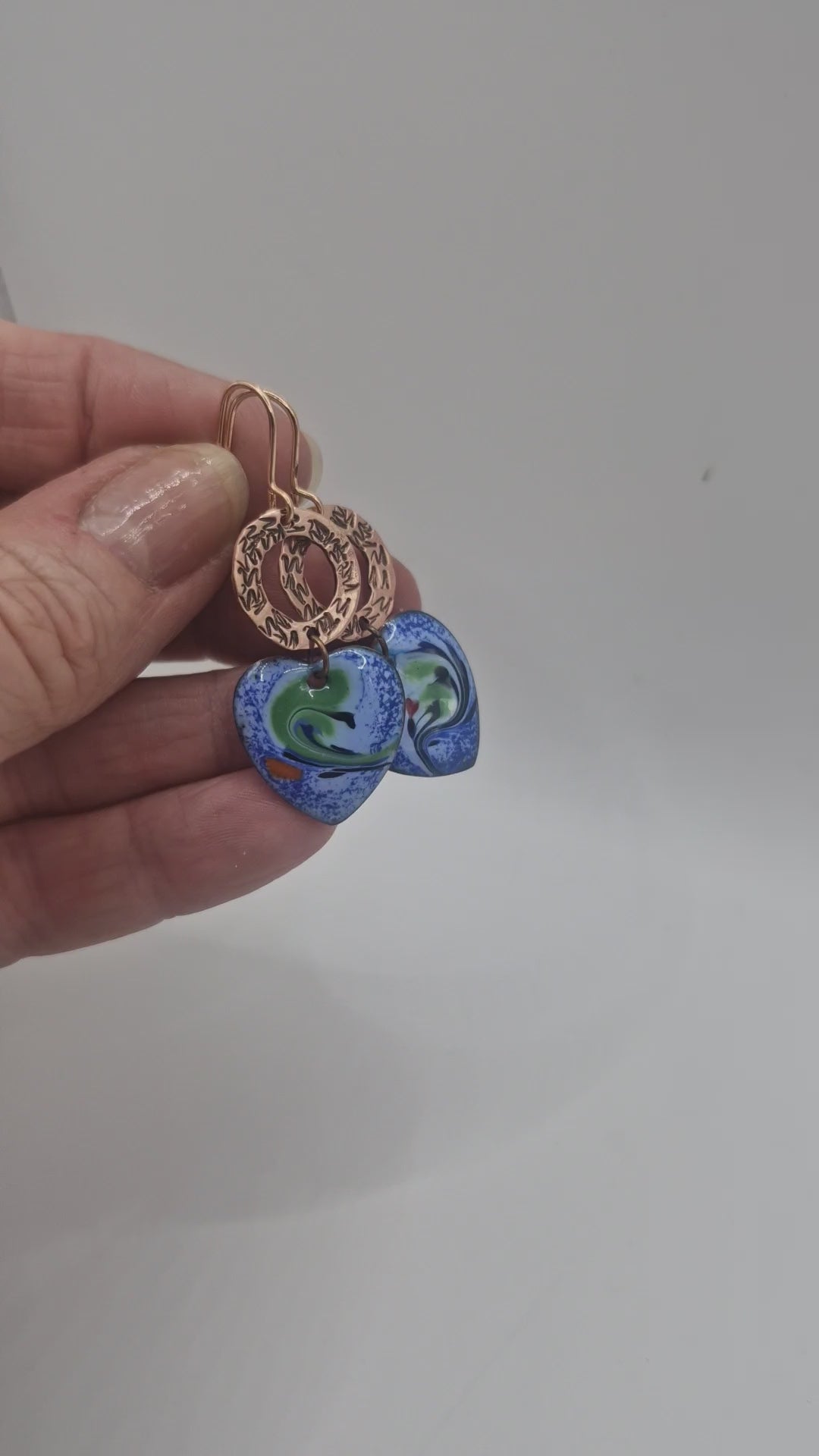 Each piece is handmade in my studio in East Cork, individually designed and created so that no two earrings are ever the same. Made from copper and enamel, the colour is formed by hand-firing powdered glass directly onto the metal using traditional torch-firing techniques, rather than a kiln — allowing the enamel to melt, pool and move organically, creating a truly unique finish every time.