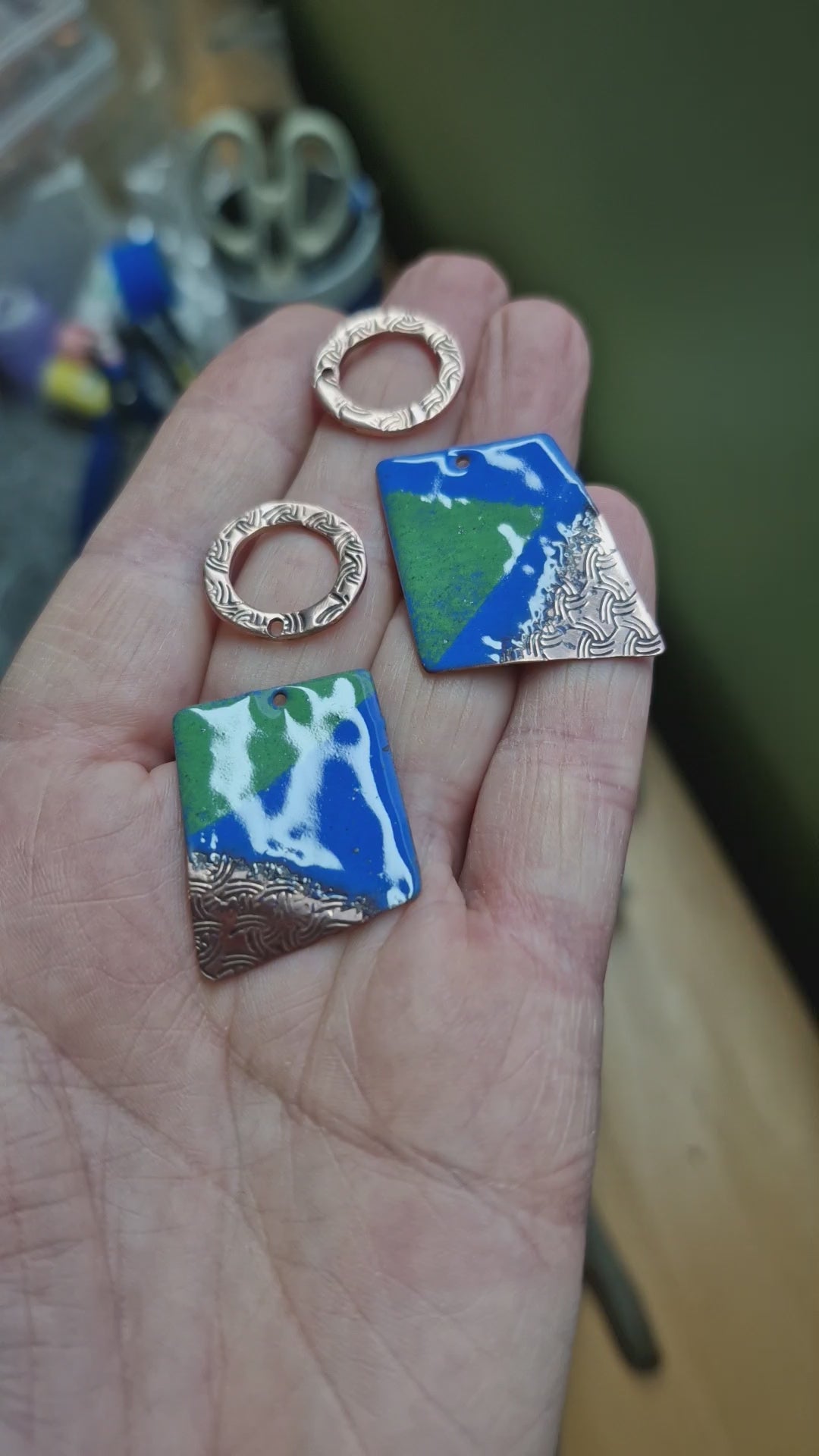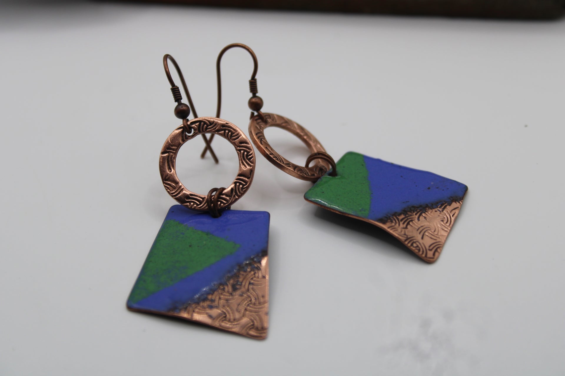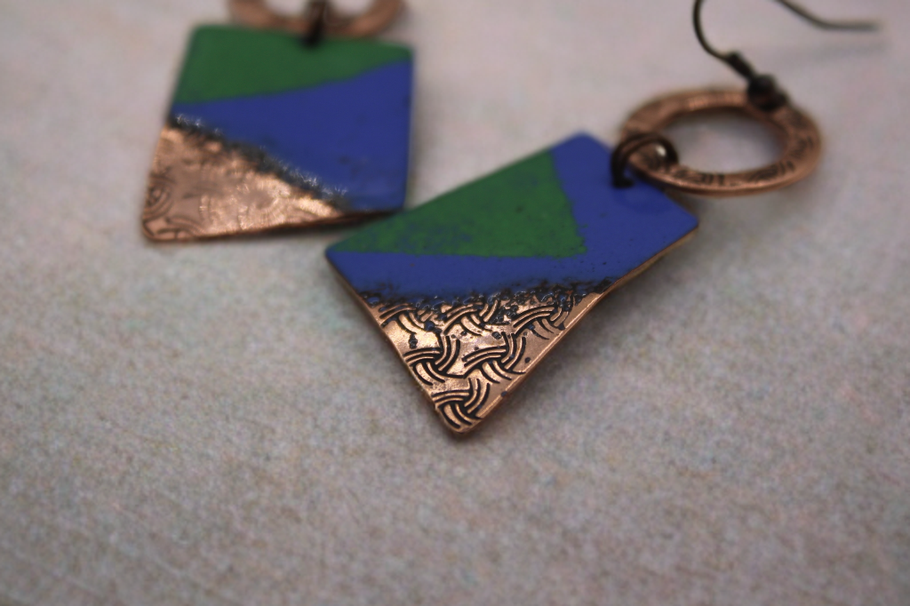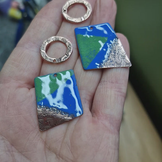 Hand-cut copper statement earrings in blue and green enamel, with oxidised copper left exposed at the edge.