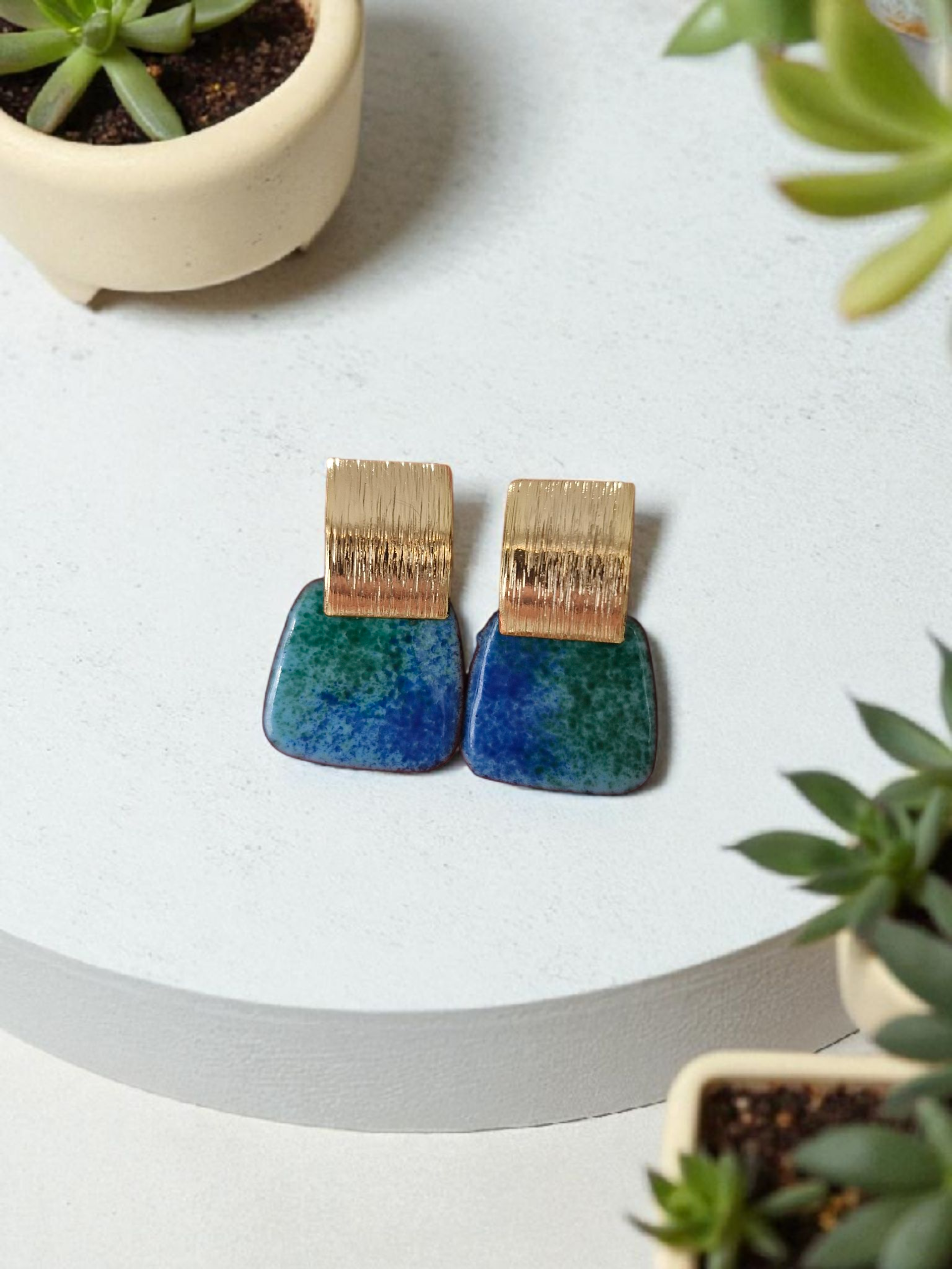 A touch of midnight glamour in the perfect size. At just under 3cm, these stud earrings balance elegance with ease — a neat, refined shape that feels both timeless and modern. Their deep enamel tones melt into rich gold, echoing the velvet hush of evening skies, while their shimmer catches the light.