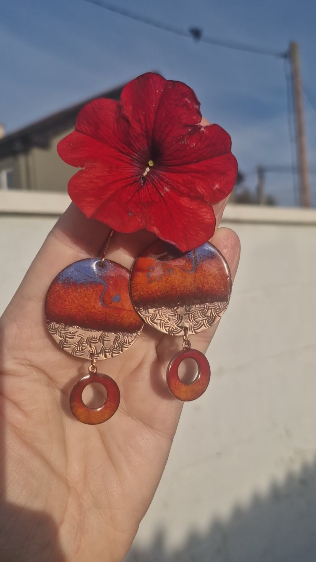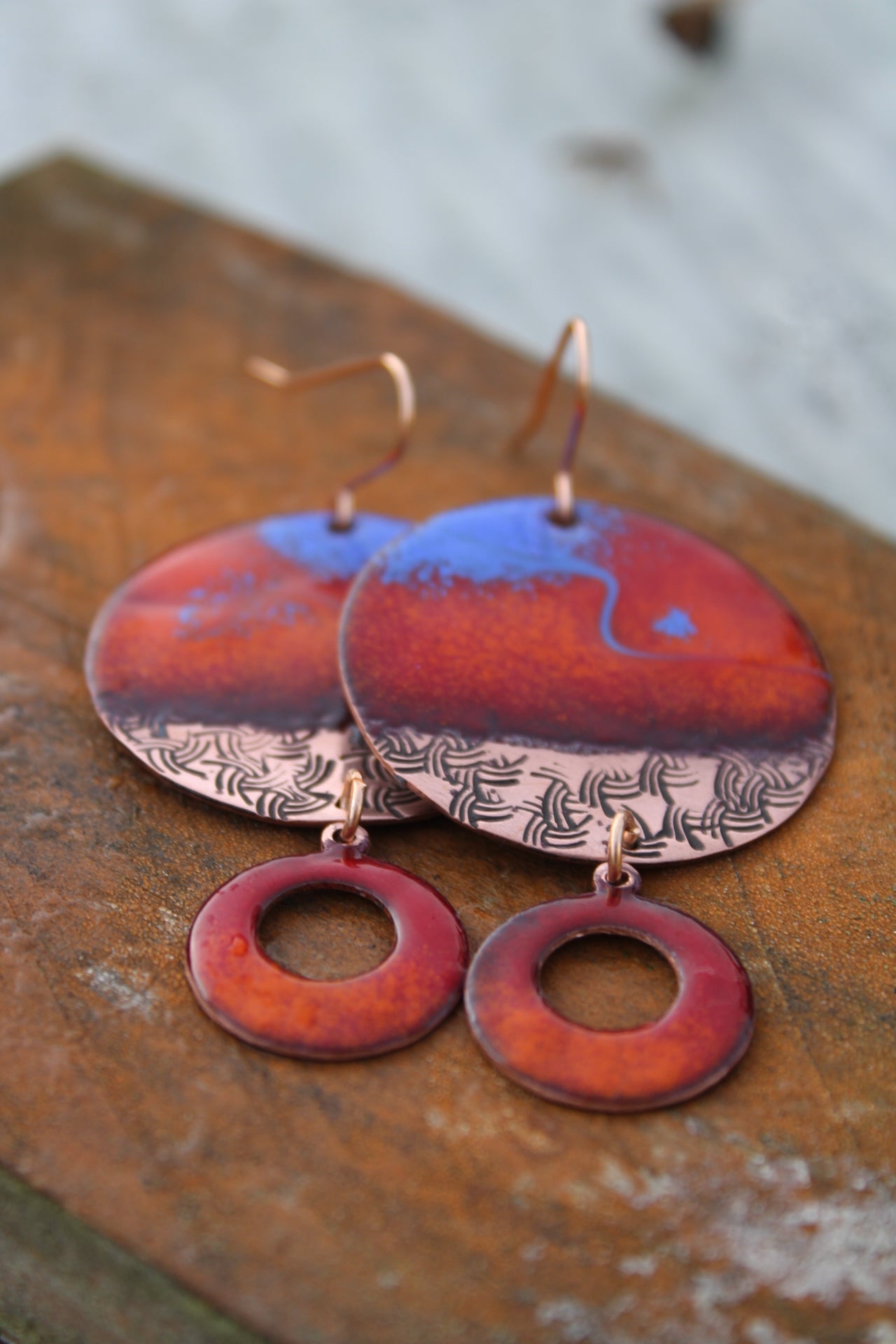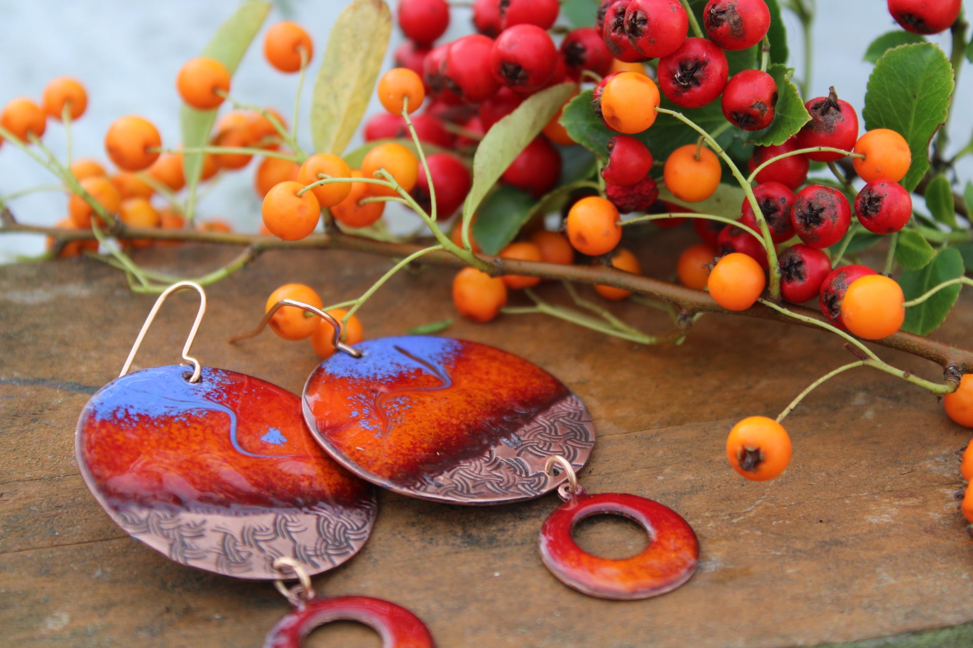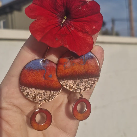 From the Copper Solstice collection, Wildfire Sky blazes with enamel reds that burn like embers against a sweep of cobalt twilight. Etched copper adds earthy grounding, while the fiery circle drop keeps the energy flowing. A statement piece alive with movement and colour — carrying the wild beauty of sky and flame.